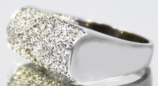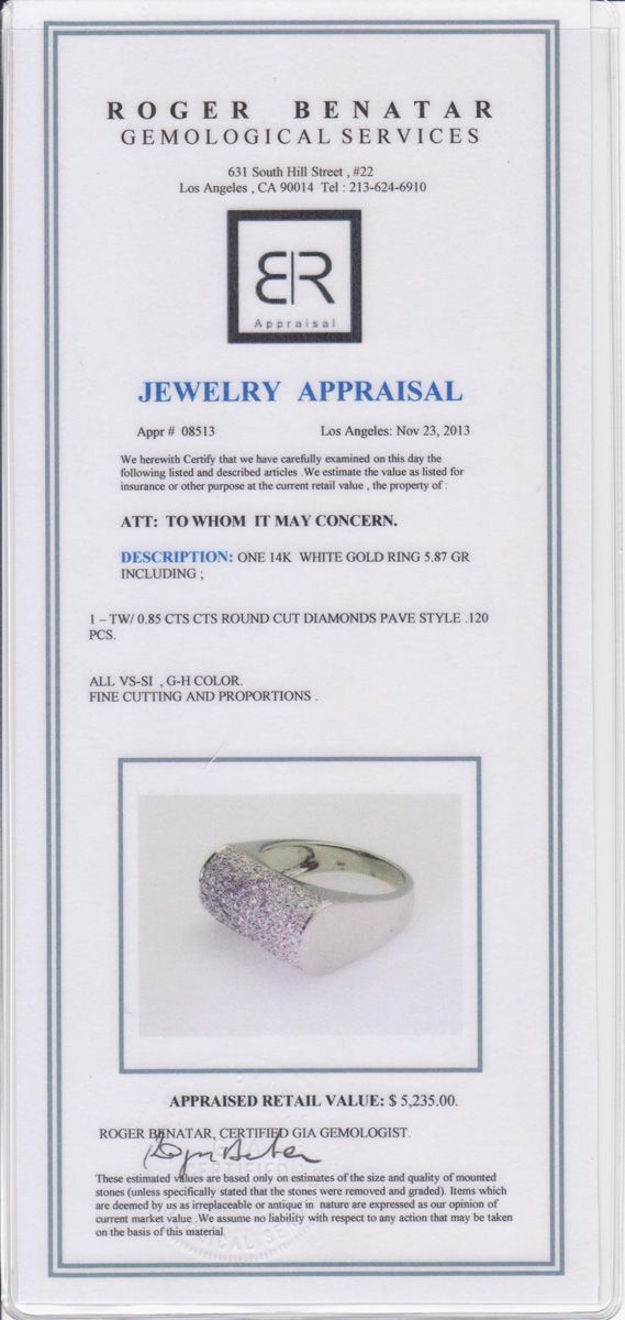 14kt White Gold 5.87 approx grams including gems, .85cttw Round White Diamond pave Style G-H color VS-SI clarity, size 5.25,includes Jewelry Appraisal, Appraised Retail Value $5235.00