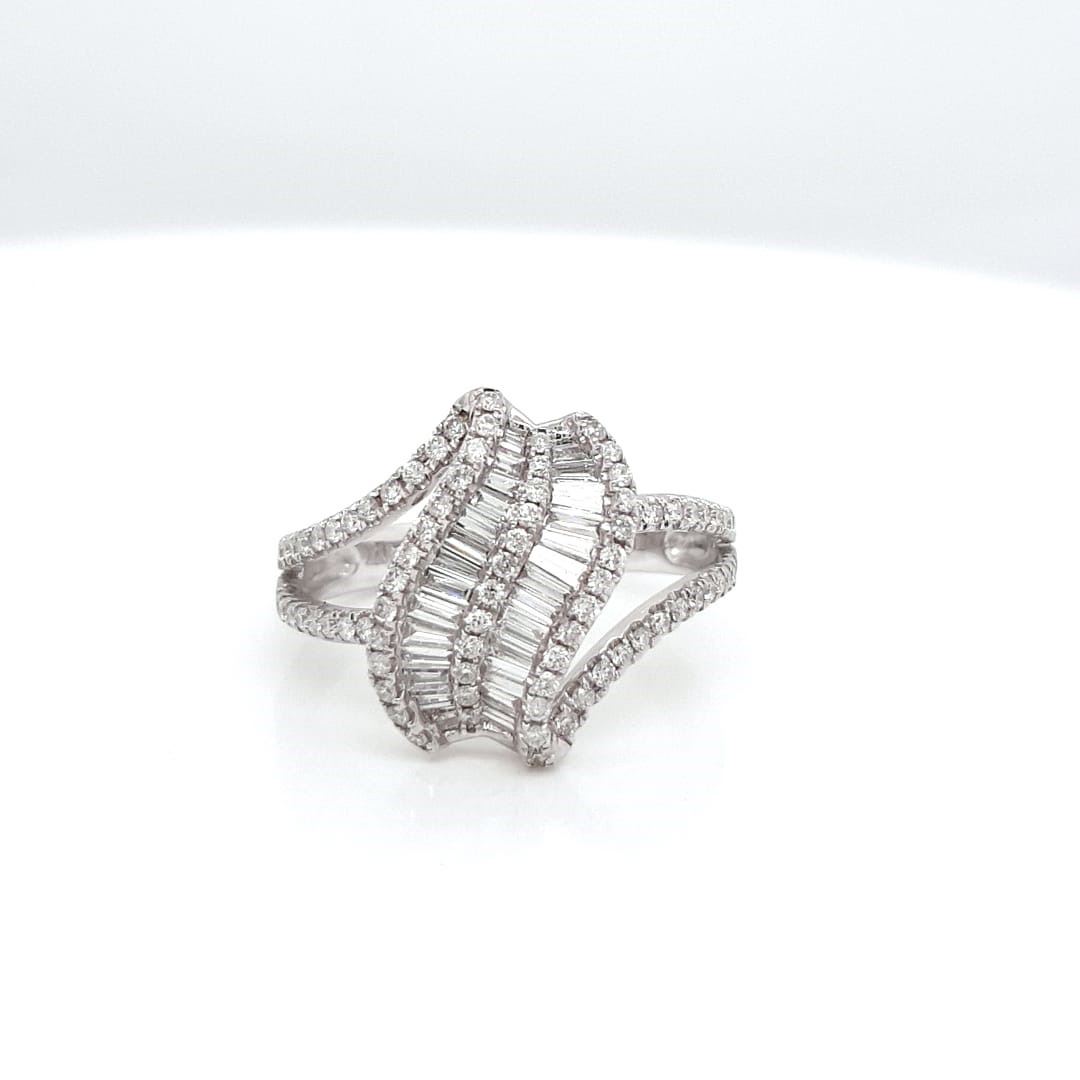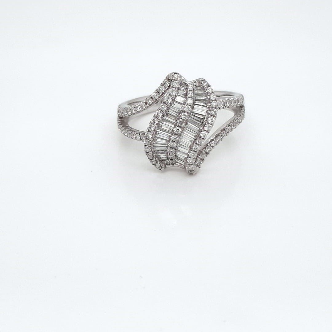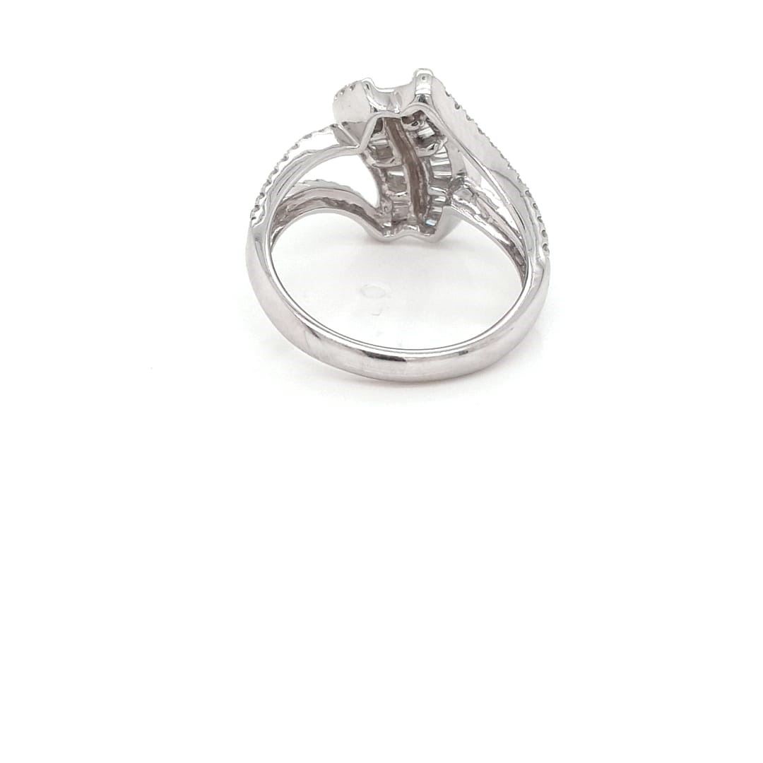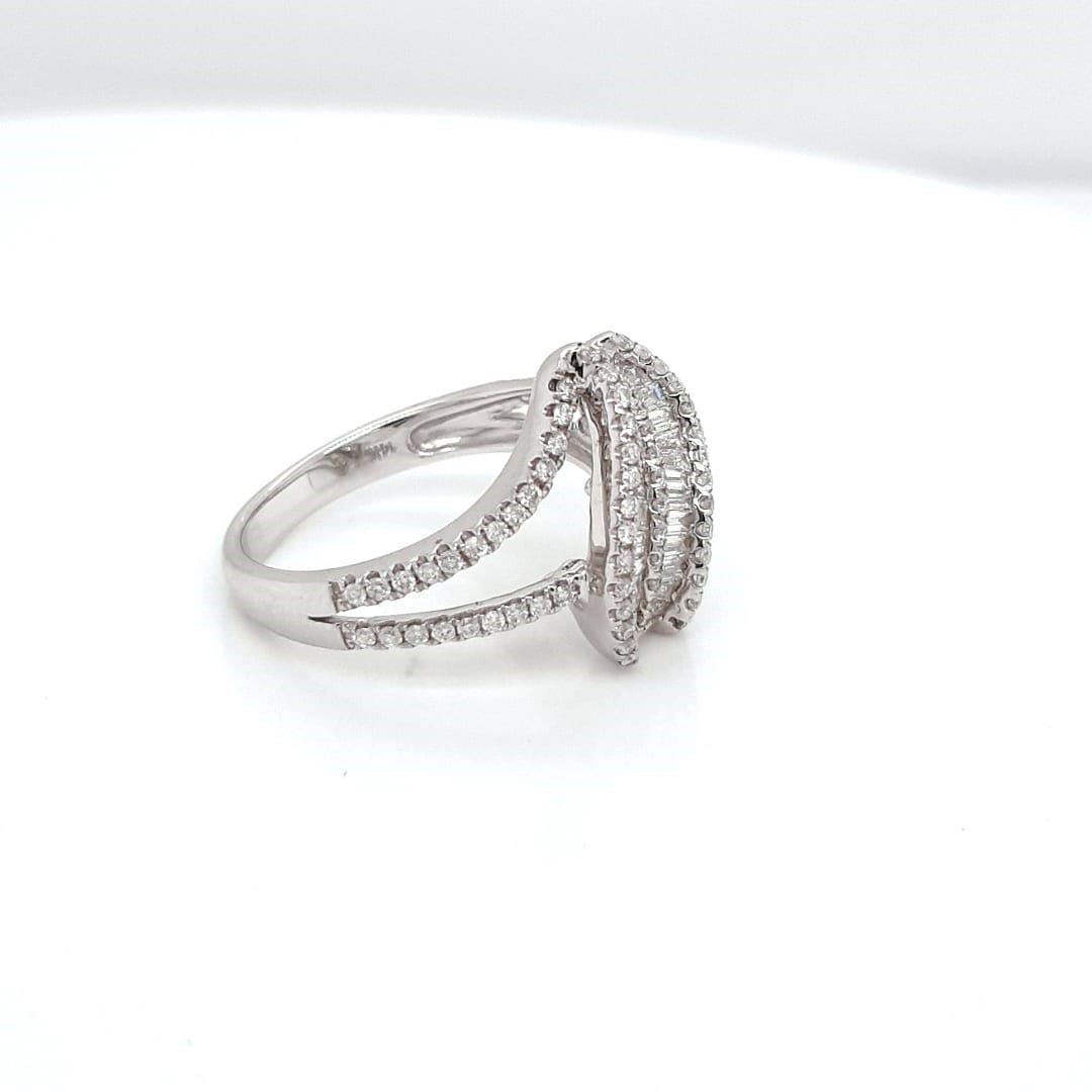 14kt White Gold Ring With Emerald cut Baguette Diamond set in the Center with Full Cut round Diamonds around it and Diamonds set half way on the ring . Color G-H , Clarity SI1-SI2 , 14kT White Gold , Natural White Diamonds , total Diamond Weight 0.95CT , Size 7 , free Sizing +/- 2 Sizes , New From Manufacture.