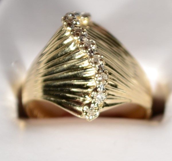 Size 6, a small amount of diamonds cascade down the center of this ring giving a very dramatic look to it. 2.4 DWT