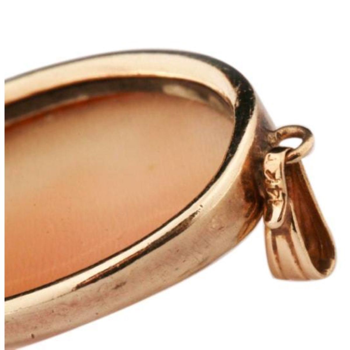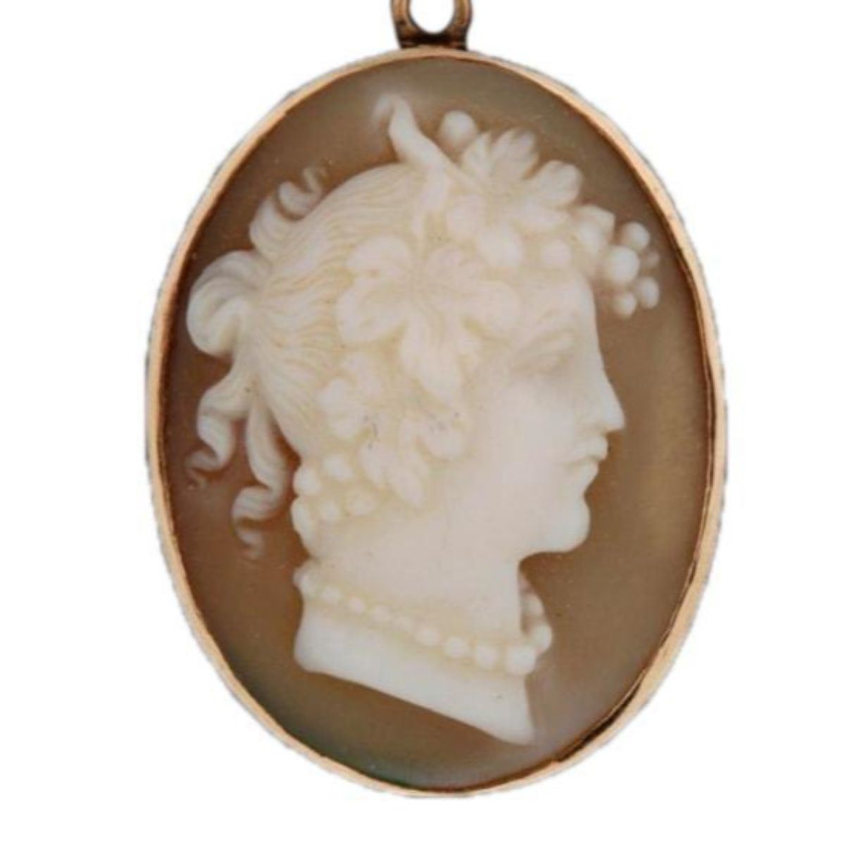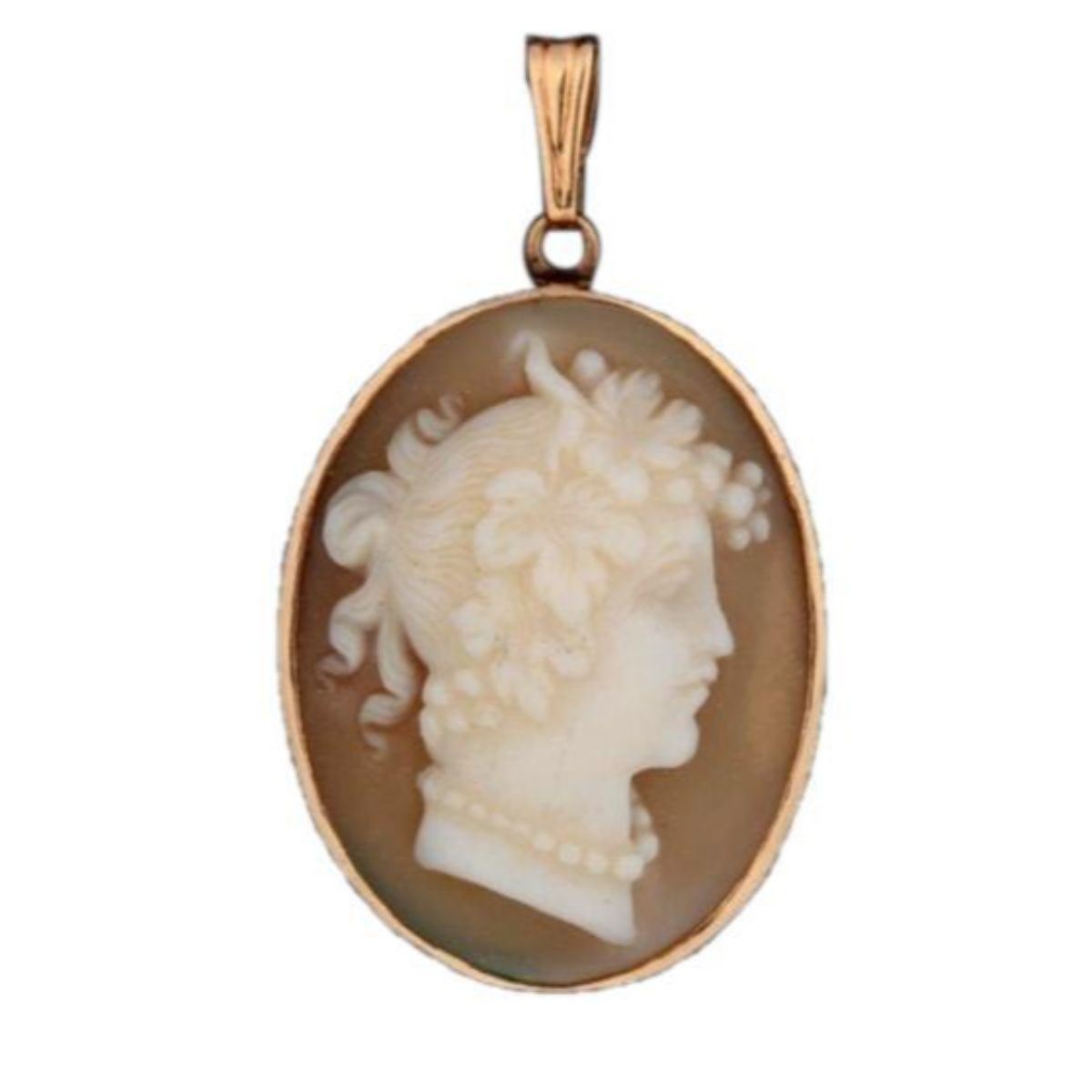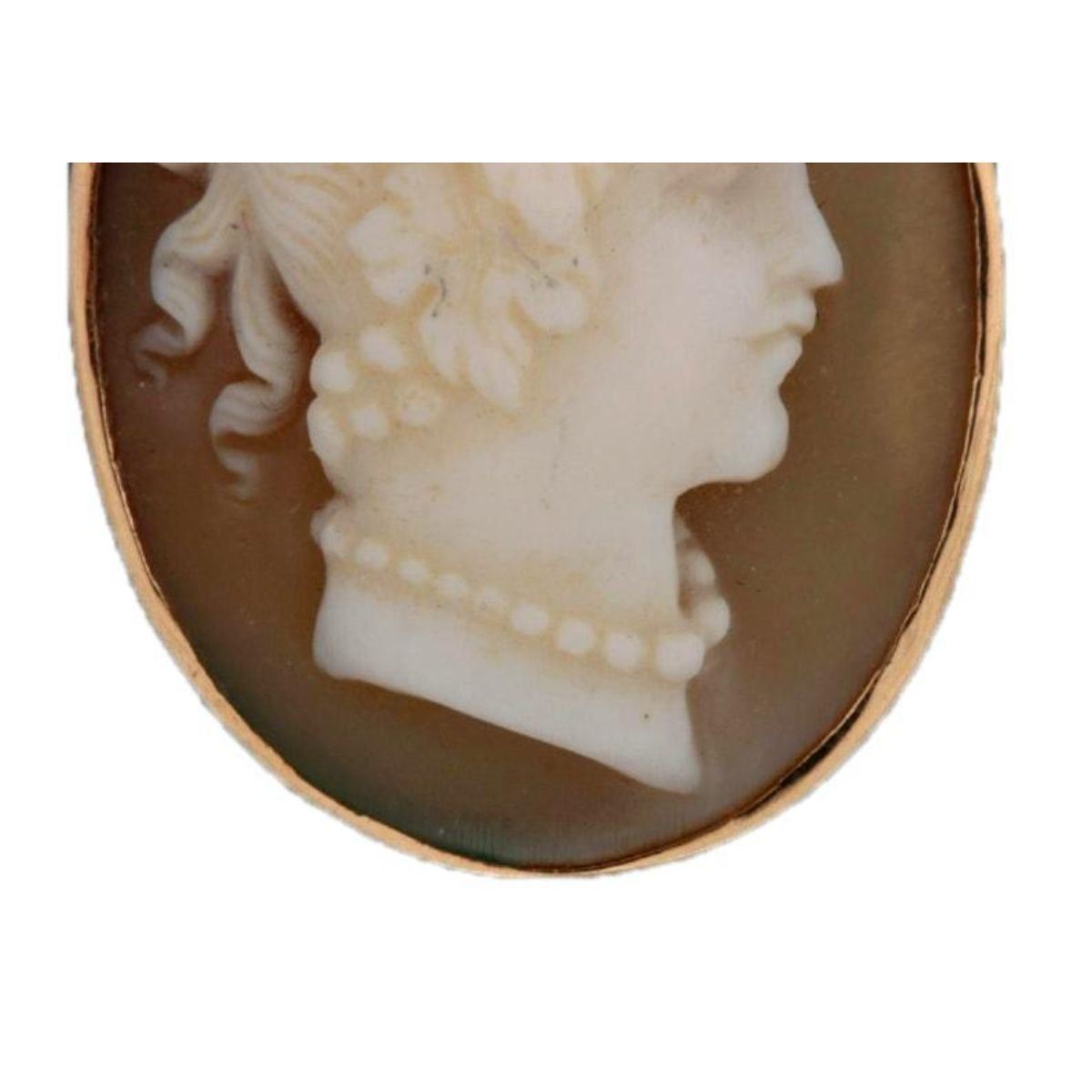 Classical bust carved shell brooch in a marked 14K setting, measures 1 1/4" L X 3/4" W with bail. Â 2.8 grams weight.