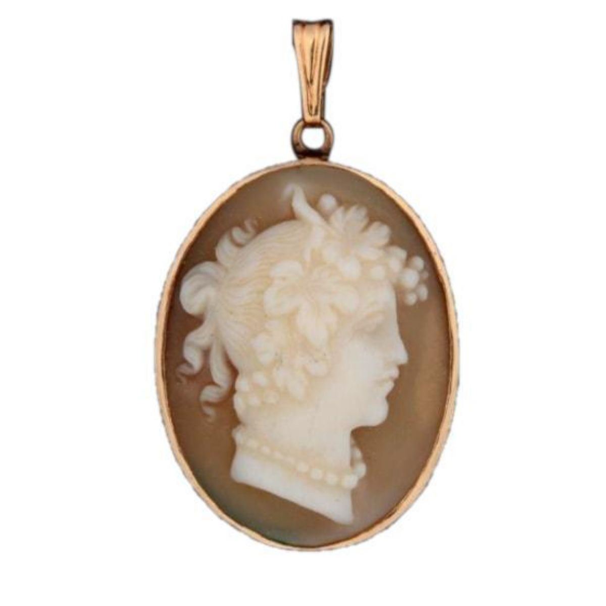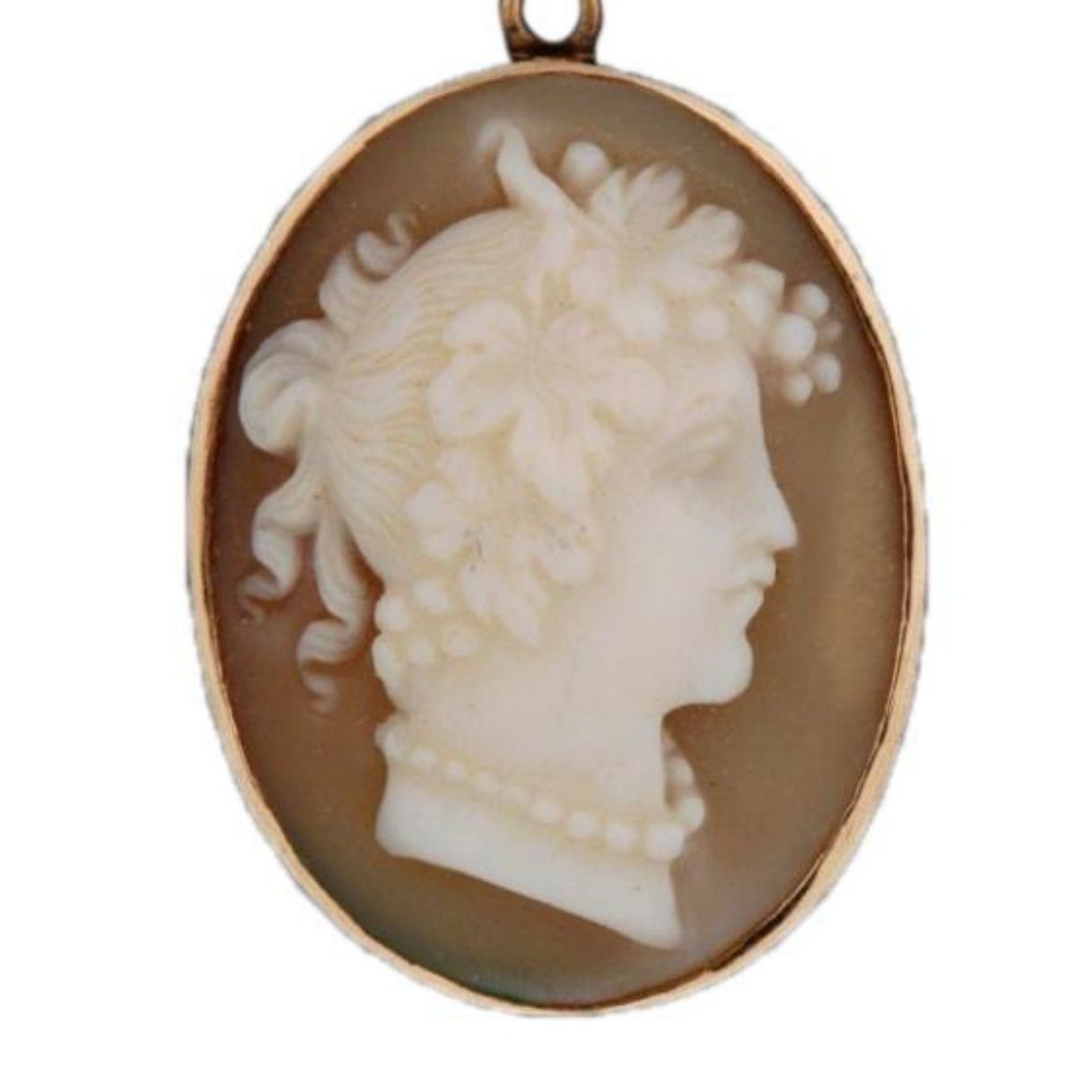 3Classical bust carved shell brooch in a marked 14K setting, measures 1 1/4" L X 3/4" W with bail. Â 2.8 grams weight.