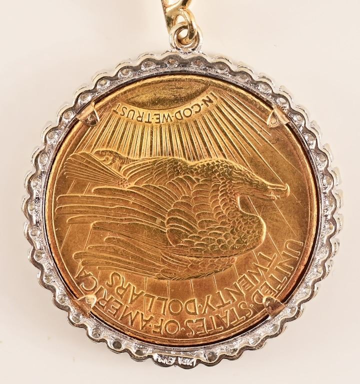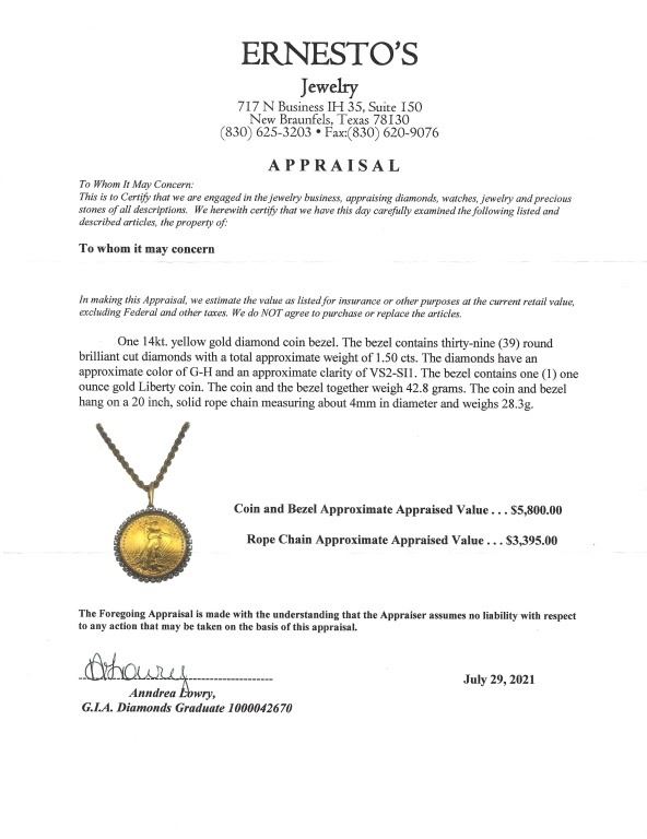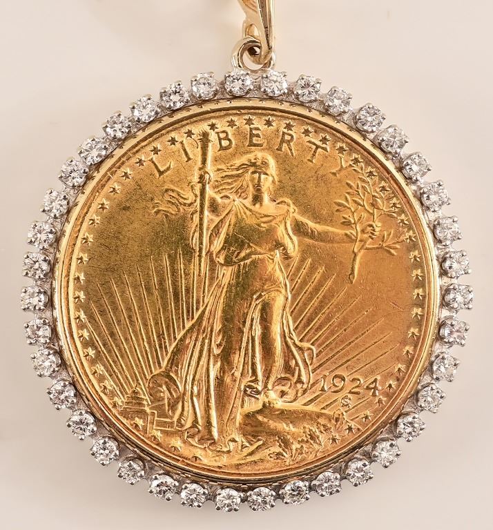 1924 US $20 Gold coin. With appraisal: "One 14kt. yellow gold diamond coin bezel. The bezel contains thirty-nine (39) round brilliant cut diamonds with a total approx. weight of 1.50 cts. The diamonds have an approx. color of G-H and an approx. clarity of VS2-SI1. The bezel contains one (1) ounce gold Liberty coin. The coin and the bezel together weigh 42.8 grams. The coin and bezel hang on a 20 inch solid rope chain measuring approx. 4mm in diameter and weighs 28.3g. Coin and Bezel Approx. Appraised Value: $5,800. Rope Chain Approx. Appraised Value: $3,395.".