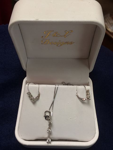 14kt Gold diamond earrings and matching pendant with 3 diamonds