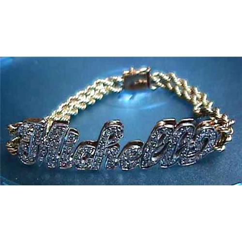 </font></strong>Custom made 14kt Yellow Gold & Diamond Michelle Name Bracelet; with double strand rope chain band and fancy scripted and relief lettering, this bracelet would make a great gift for that special Michelle in your life.</font>