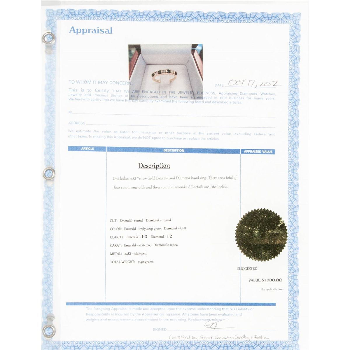 Includes 1000 appraisal