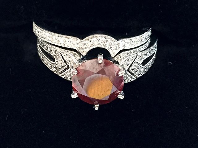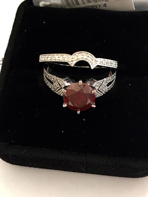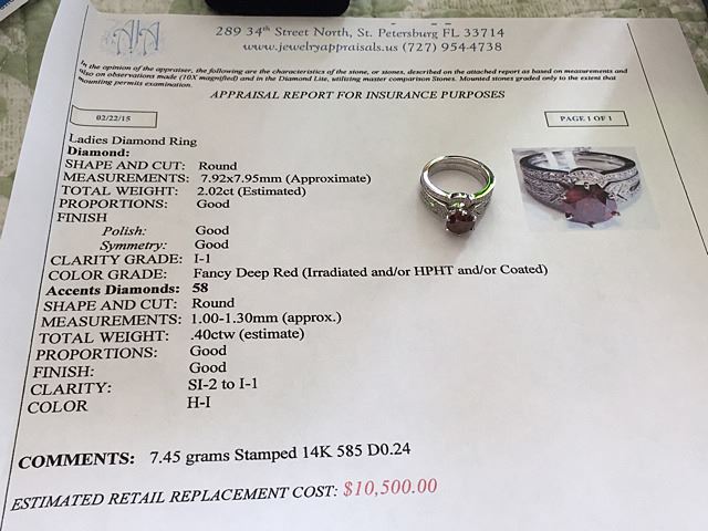 This is a beautiful 14kt gold ladies diamond ring with a round Fancy Deep Red (Irradiated and/or HPHT and/or Coated) 2.02ct (estimated wieght), clairty grade of I-1. 58 Additional round accent diamonds adorn the band, measuring an estimated total of .40ctw with a SI-2 to I-1 clarity and H-I color. The band is a 2 piece designed set. Appraised with an estimated retail replacement cost of $10,500.00.