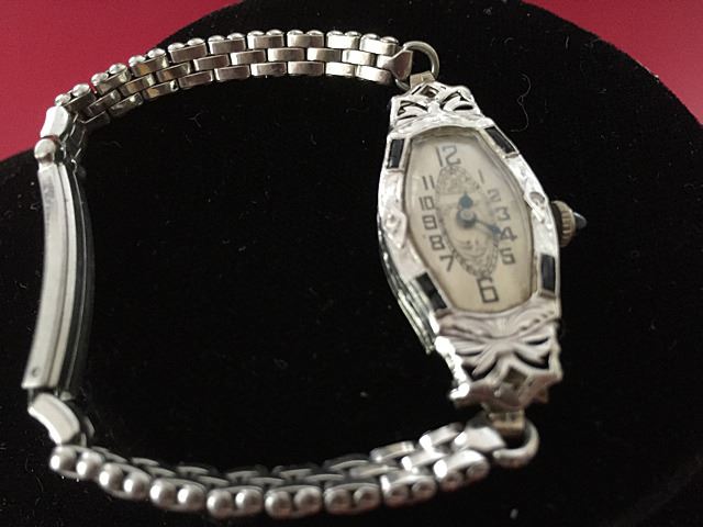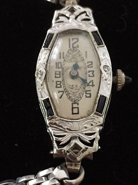 14kt white gold vintage ladies Swiss wrist watch in Art Deco Style, case is 14kt white gold, bracelet is not gold.