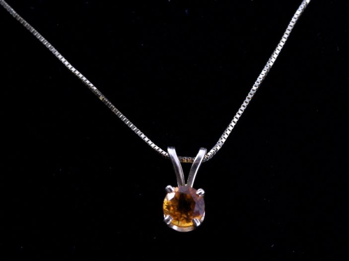 This is a 14kt yellow gold necklace showing a wonderful round brilliant cut Citrine stone with impressive bright quality. The necklace is marked 14kt Italy and the setting is also marked 14kt. The piece tested higher than 14kt gold (more like18kt). Strand measures 16" (clasp is also gold).