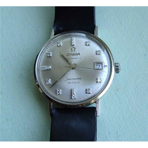 Clean vintage 14kt white gold gentleman's Omega Seamaster De Ville automatic wristwatch with sleek and slender lugs, a diamond hour designation silver tone dial, pointed hands, sweep seconds as well as date function, Omega insignia crown. Size: 33.70mm case diameter.