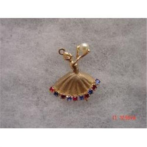 Here is a lovely signed 14kt yellow gold ballerina charm or pendant. There is a genuine pearl that she is holding, there are sapphires, rubies and garnets around her skirt! Very very nice and excellent condition this is 1 inch tall