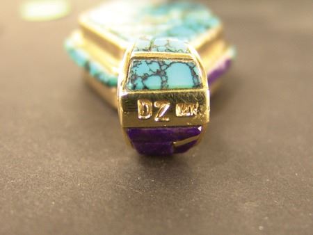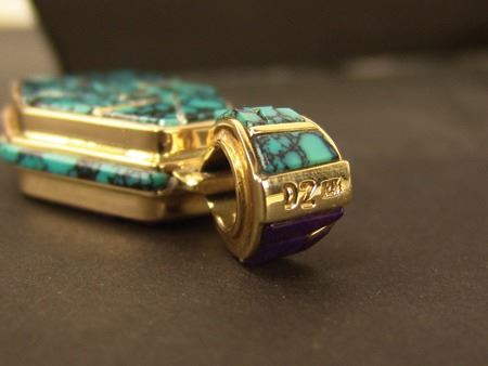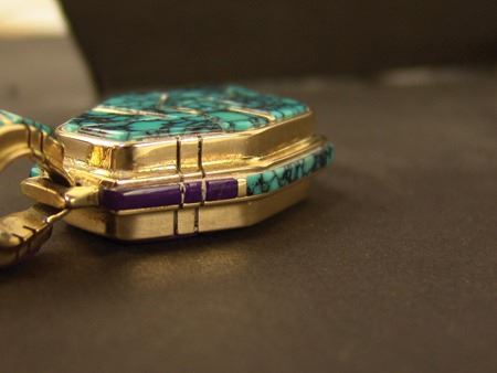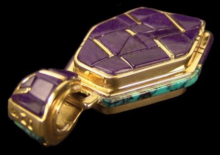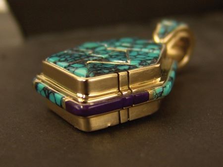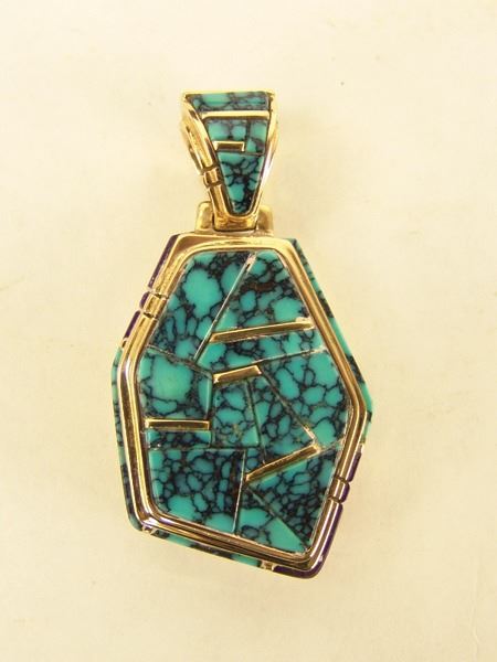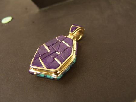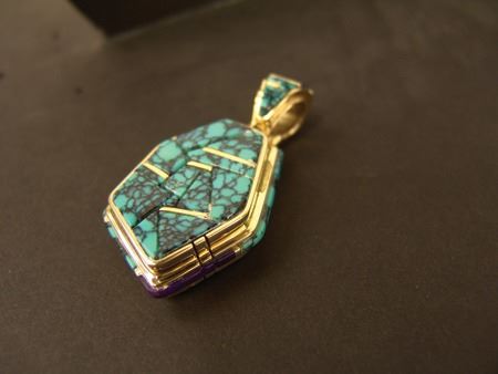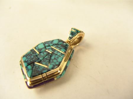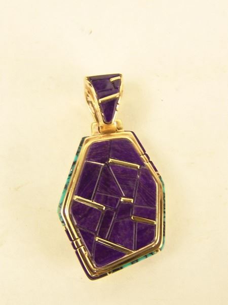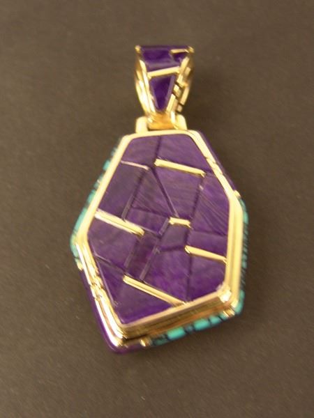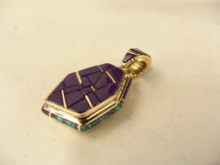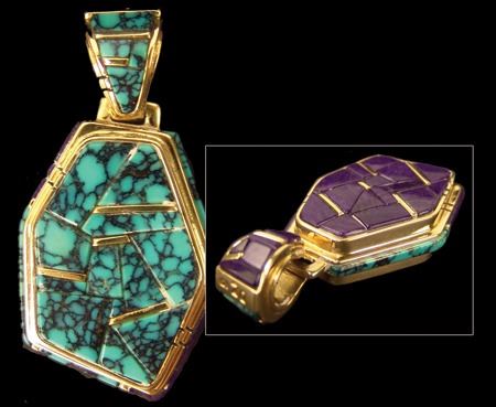 Late 1900s, Exquisite contemporary heavy gauge 14kt gold 2-sided pendant, one side with raised and carved inlay premium sugalite, the other with high grade Indian Mountain spiderweb turquoise, including matching inlaid hanging bail; 2.02 ozT. Pendant 2-1/2" x 1-1/4"