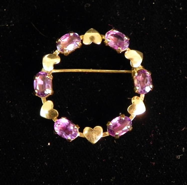 Available is this 14kt Gold Pin with Six Amethyst Stones.