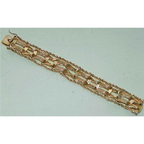 Fantastic 14kt yellow gold lady's bracelet with a pair of rope twist border strands, centered with a pair of flexible and loose mesh strands fixed in position with fancy open work pear crown shaped links, marked 14k, measures 7 inches length, 20mm width, weighs approximately 41 grams and would make a spectacular gift.