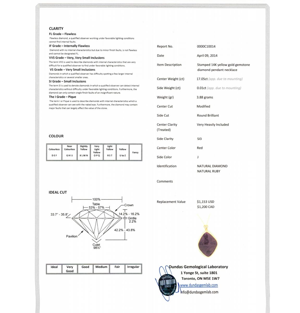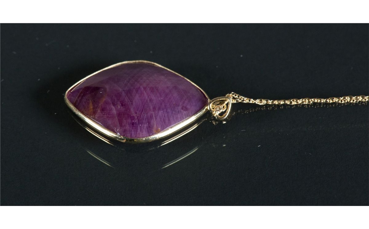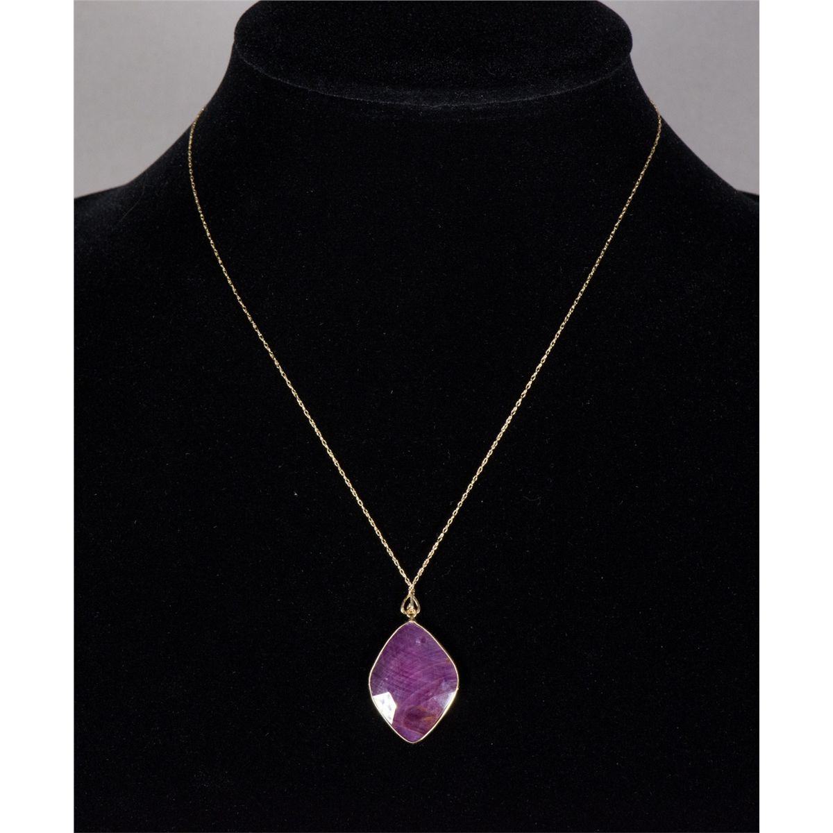 Stamped 14k yellow gold gemstone natural diamond and natural ruby pendant necklace; D: 14 cm, Pendant: H: 27.62 mm, W: 20.31 mm, 5 grams, Certificate Replacement Value $1153