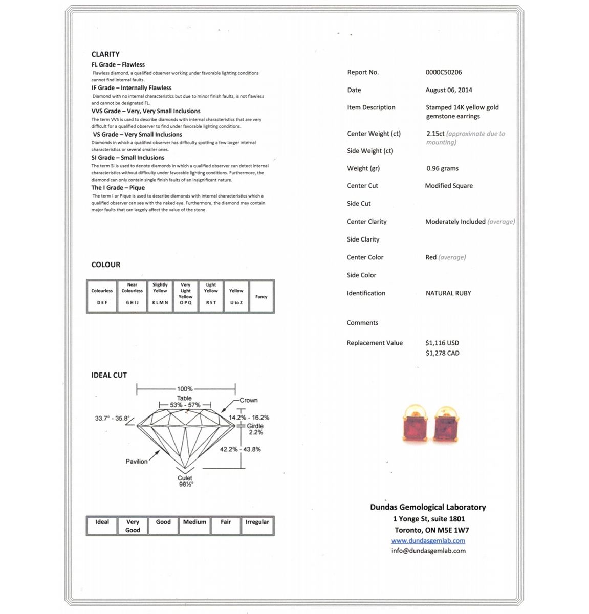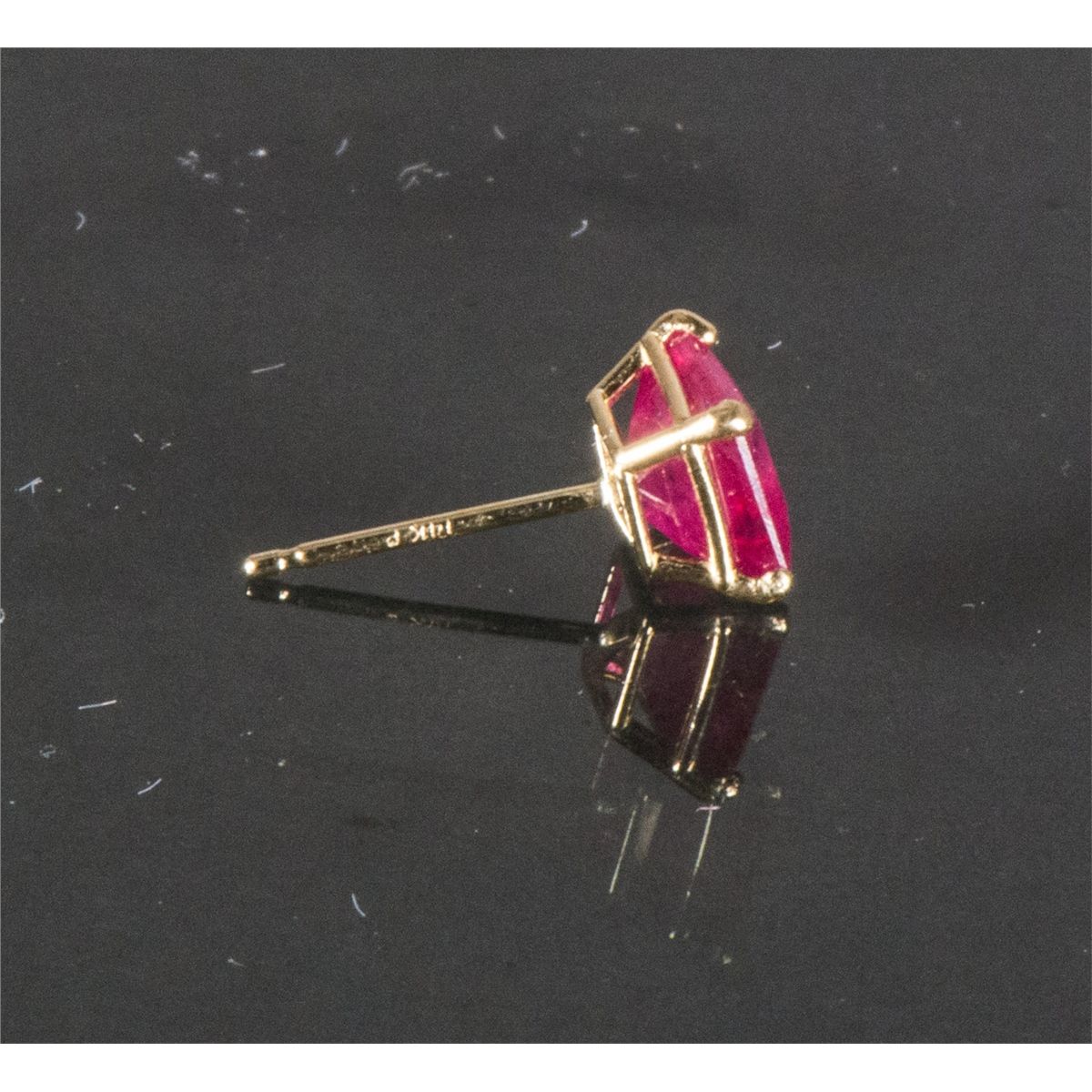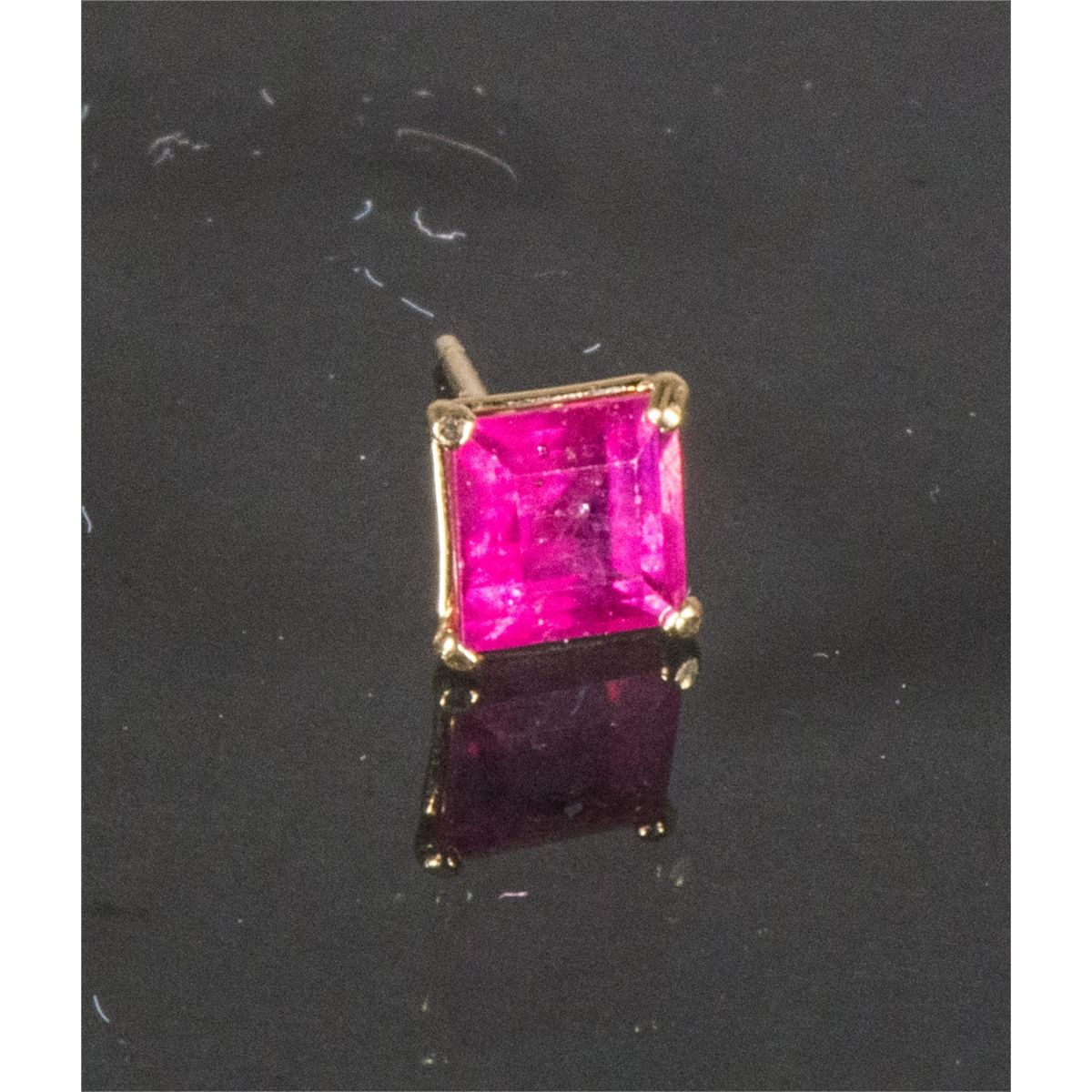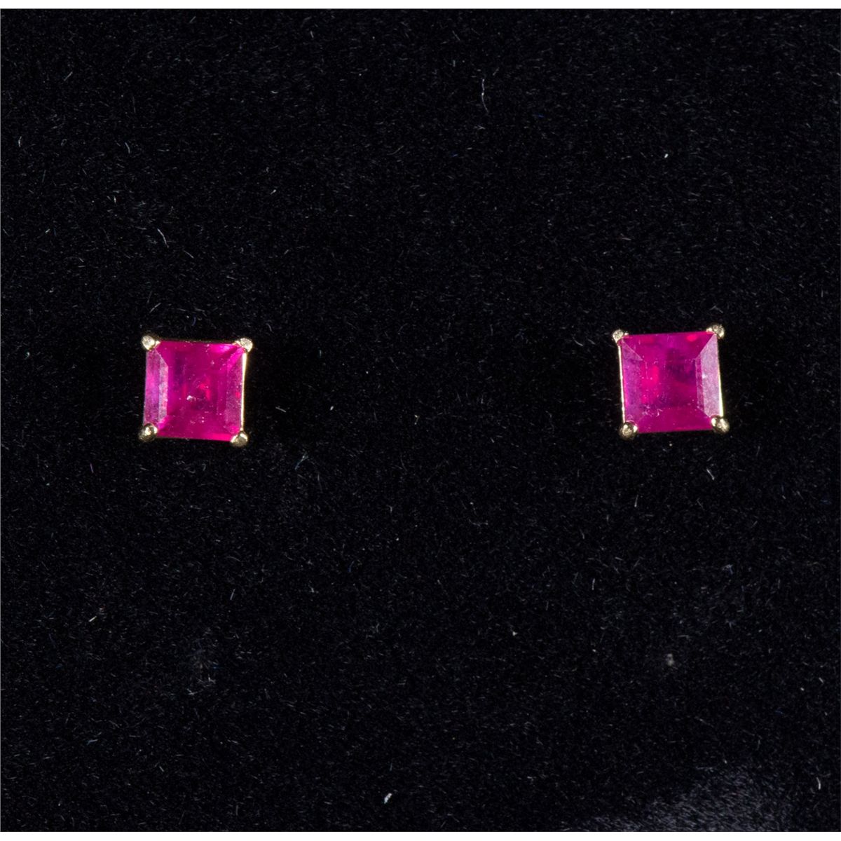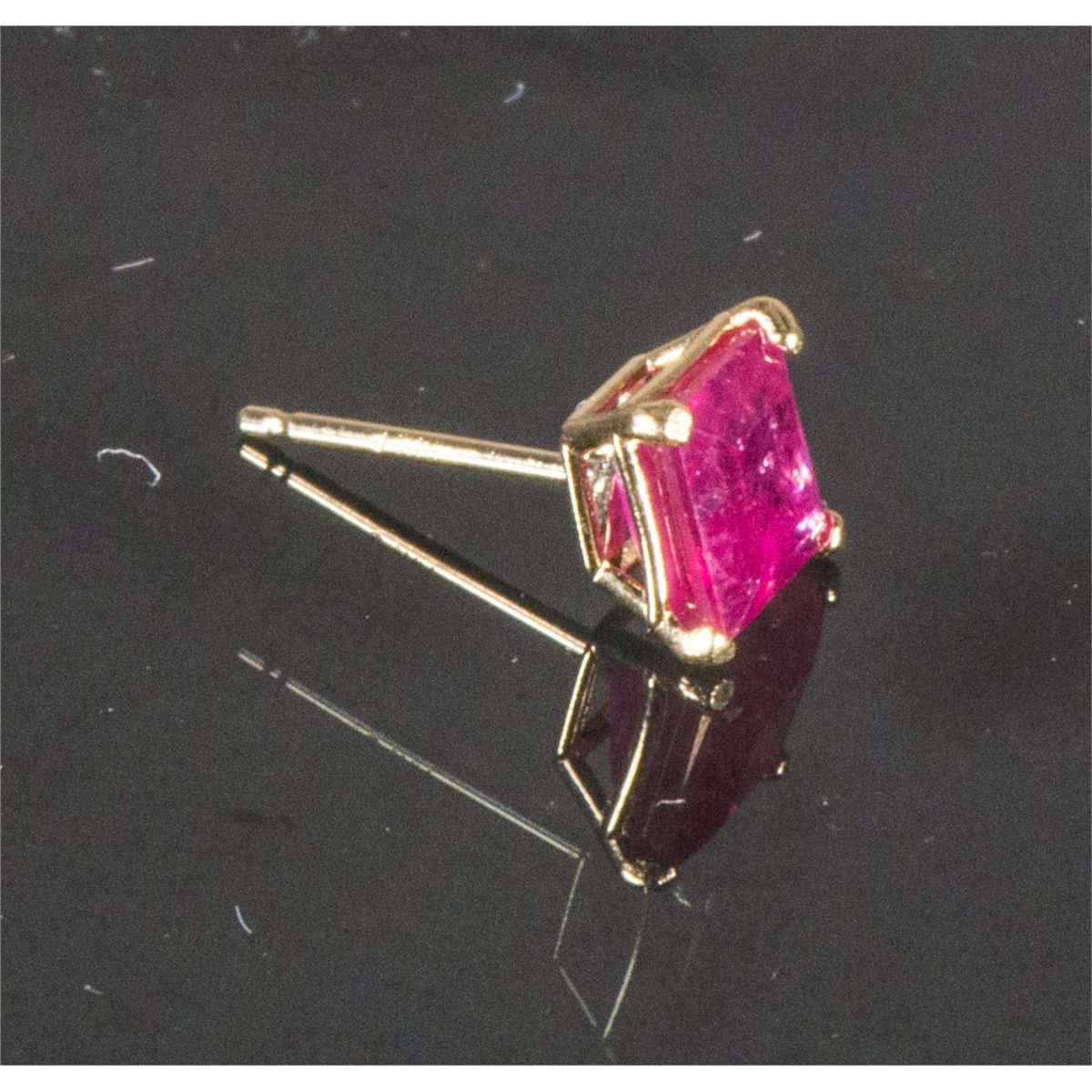 Stamped 14k yellow gold gemstone earrings; comprised of carved square natural ruby; H: 5.97 mm, W: 5.97 mm, 1 gram total, Certificate Replacement Value $1116