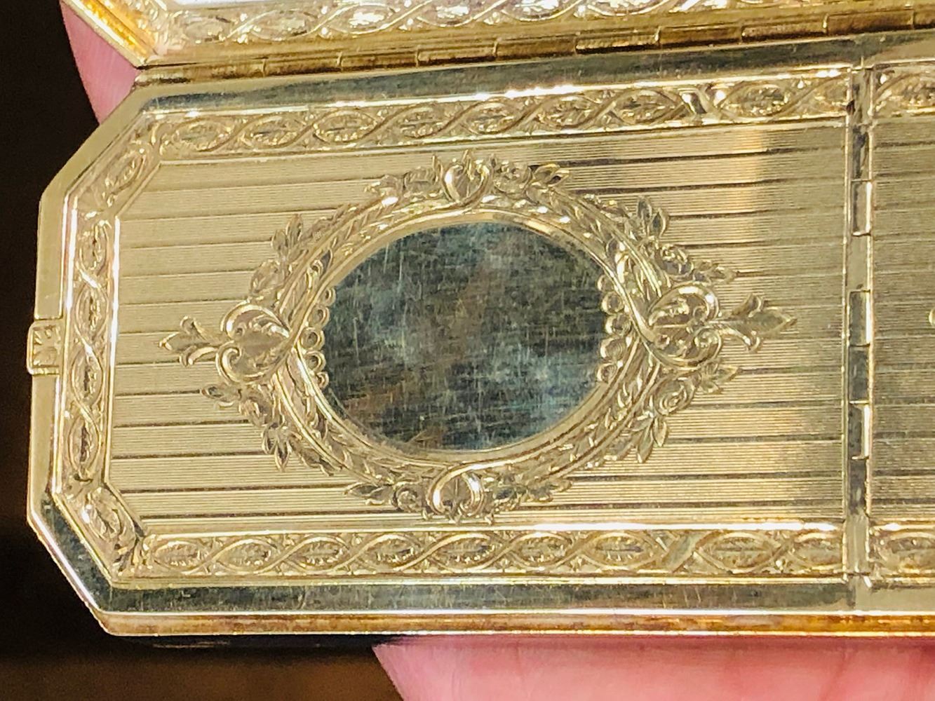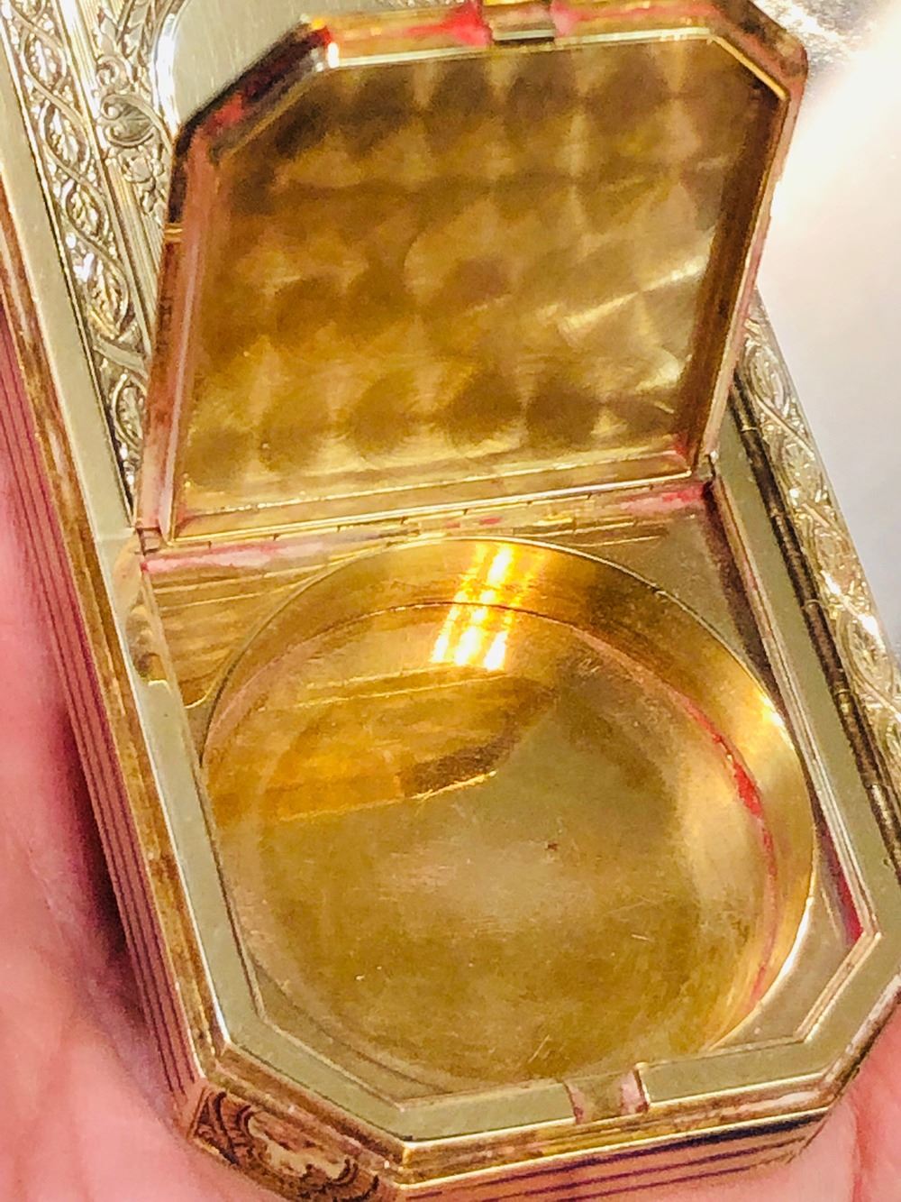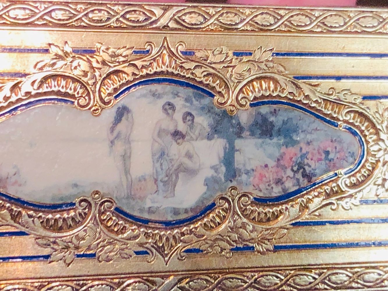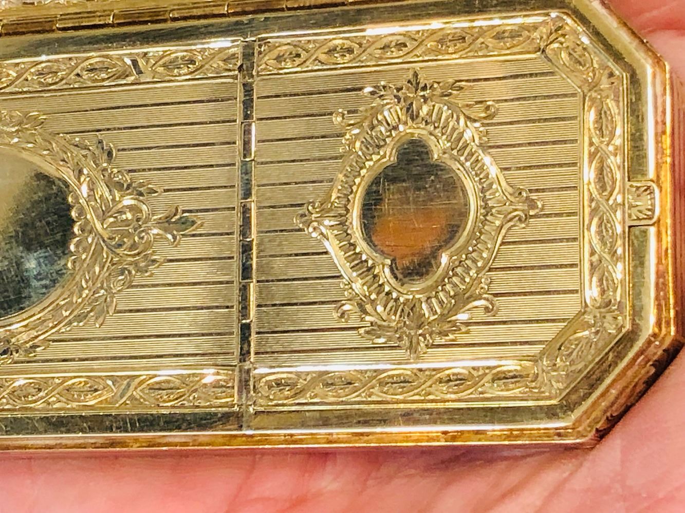 Very rare, spectacular piece. 14kt gold ladies compact or pill box, outer cover has enamelled Victorian scene, lid lifts to reveal 2 separate compartments. Fine engraving through out cover, sides and inner lids. Engraved on bottom with name and address of Manhattan, New York City. c. 1860s, this piece is attributed to possibly Tiffany and Co. Stamped 14kt, the gold weight is 198.4 grams. This is a very rare find in today's market.