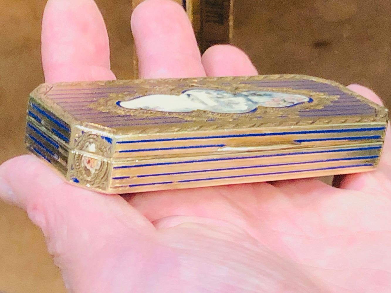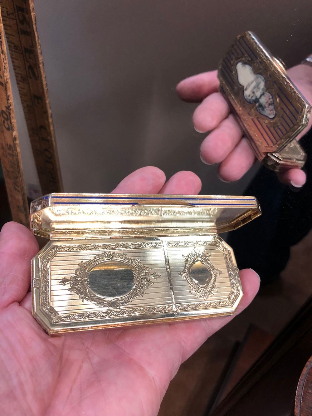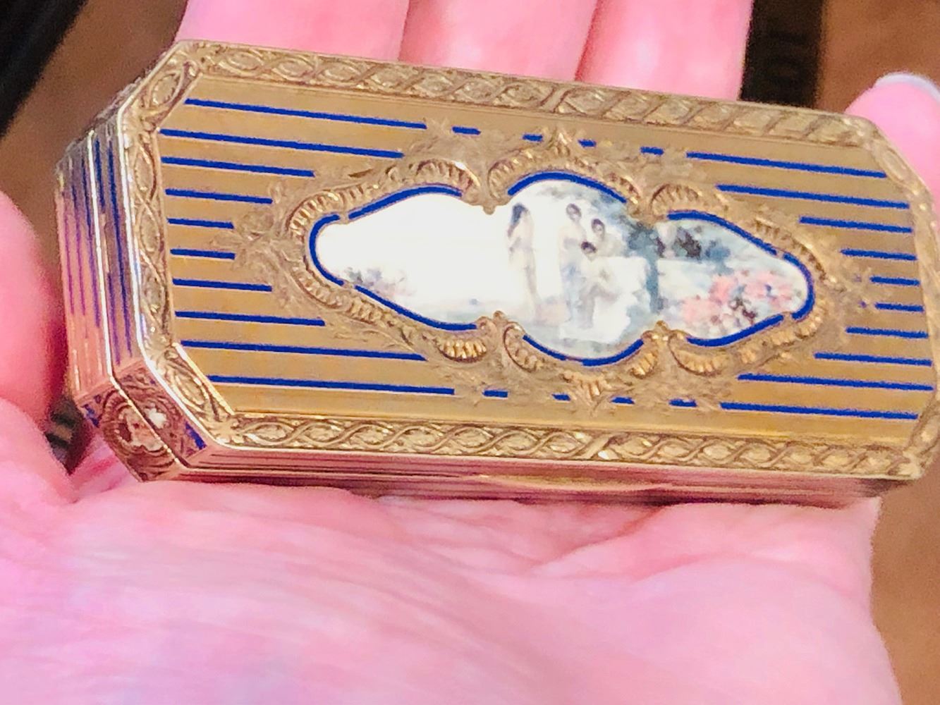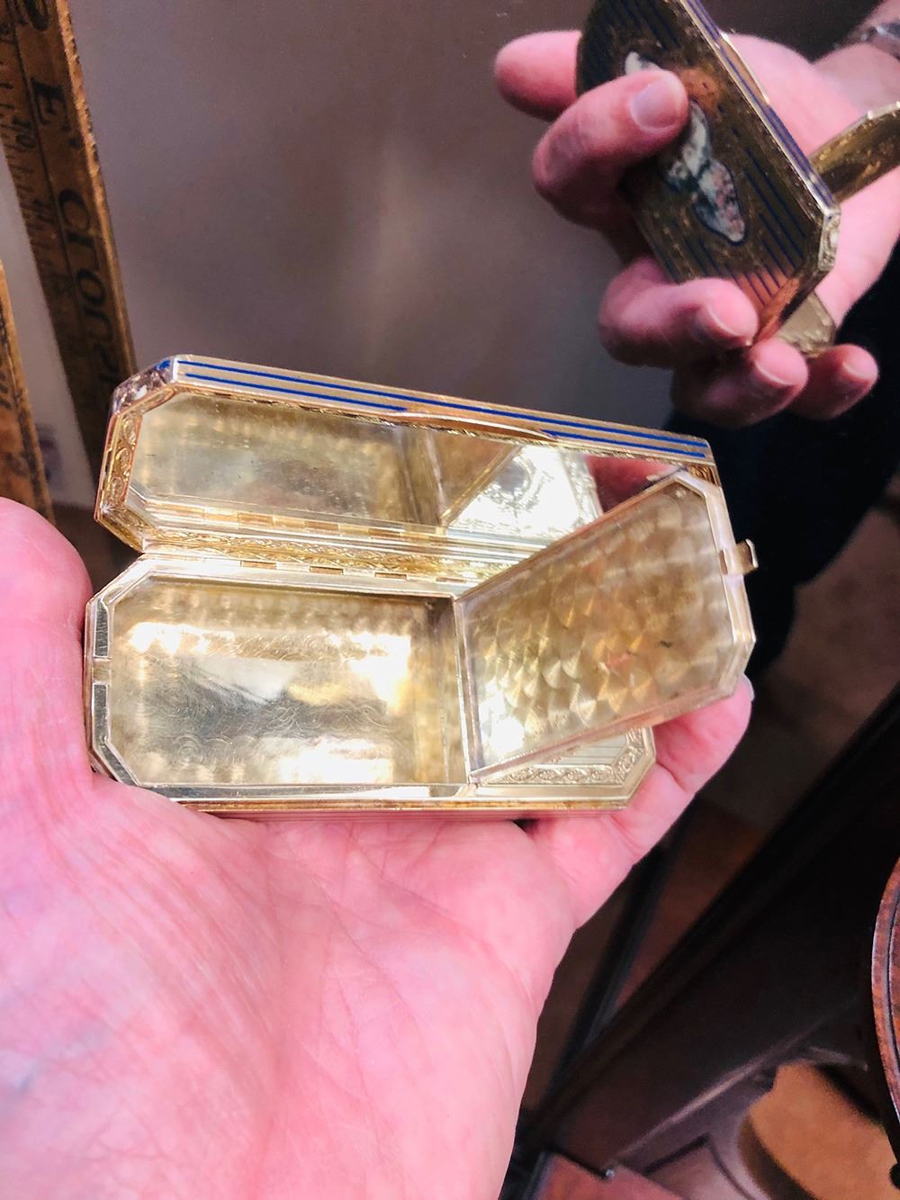 Very rare, spectacular piece. 14kt gold ladies compact or pill box, outer cover has enamelled Victorian scene, lid lifts to reveal 2 separate compartments. Fine engraving through out cover, sides and inner lids. Engraved on bottom with name and address of Manhattan, New York City. c. 1860s, this piece is attributed to possibly Tiffany and Co. Stamped 14kt, the gold weight is 198.4 grams. This is a very rare find in today's market.