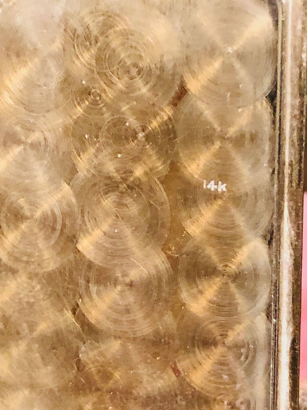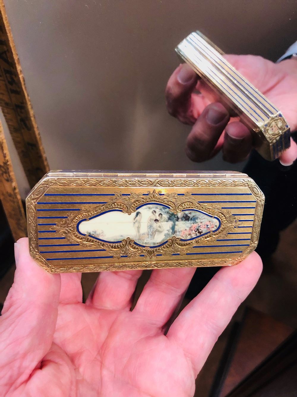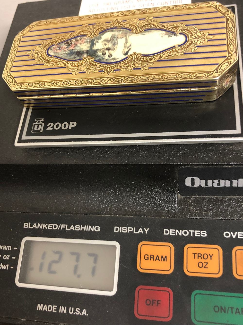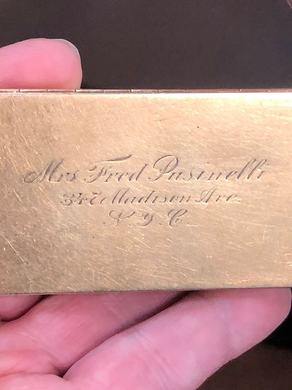 Very rare, spectacular piece. 14kt gold ladies compact or pill box, outer cover has enamelled Victorian scene, lid lifts to reveal 2 separate compartments. Fine engraving through out cover, sides and inner lids. Engraved on bottom with name and address of Manhattan, New York City. c. 1860s, this piece is attributed to possibly Tiffany and Co. Stamped 14kt, the gold weight is 198.4 grams. This is a very rare find in today's market.