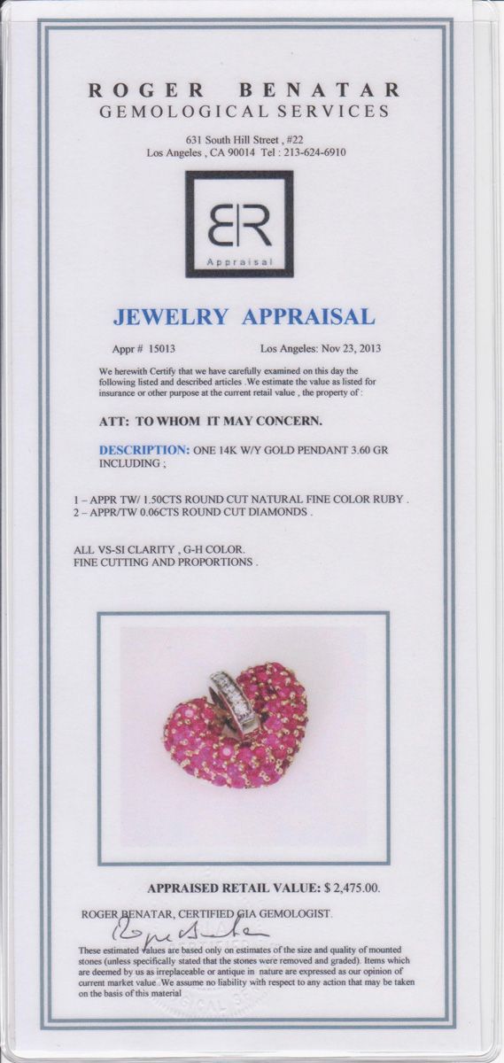 14kt Yellow/White Gold 3.60 approx grams including gems, 1.50cttw Natural Ruby Deep Red Color Round, .06cttw Round Diamond (on Bail) G-H color VS-SI clarity, includes Jewelry Appraisal, Appraised Retail Value $2475.00