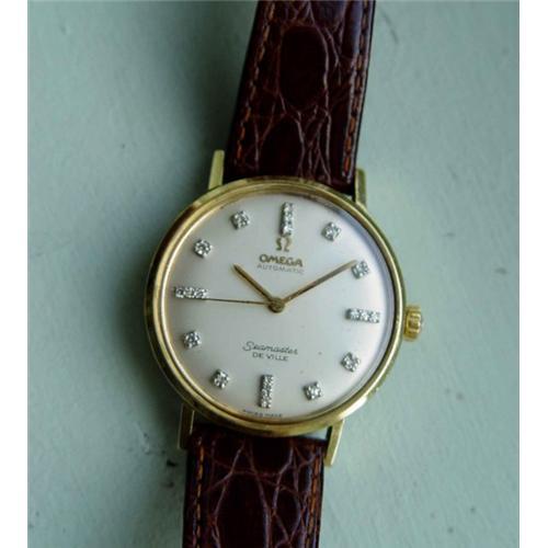 Clean vintage 14kt yellow gold gentleman's Omega Seamaster De Ville automatic wristwatch with sleek and slender lugs, a diamond hour designation silver tone dial, gold tone pointed hands, sweep seconds function and Omega insignia crown. Size: 34.00mm case diameter. Condition: very minor normal wear, very good working condition.