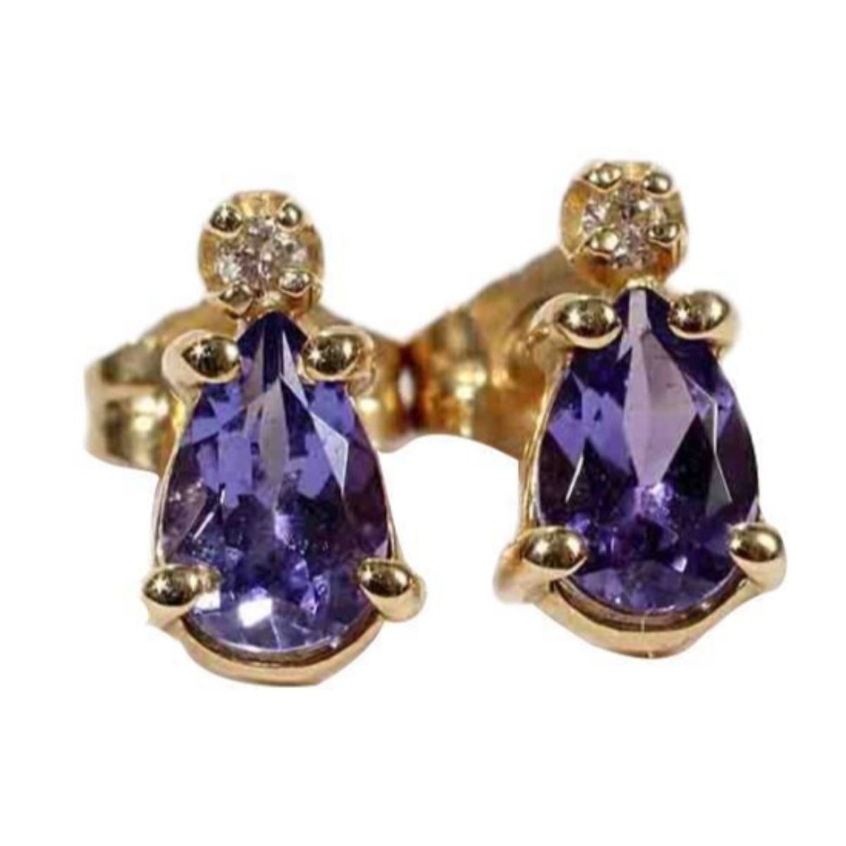 Pear faceted tanzanites with 2 tiny diamond accents set in 14kt yellow gold post earrings.