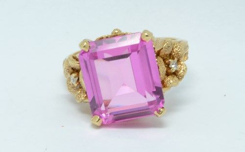 14kt Pink stone ring with Diamond Accents. Size 8 1/2. 11.99mm x 11mm. Estimated at $250.00 - $300.00
