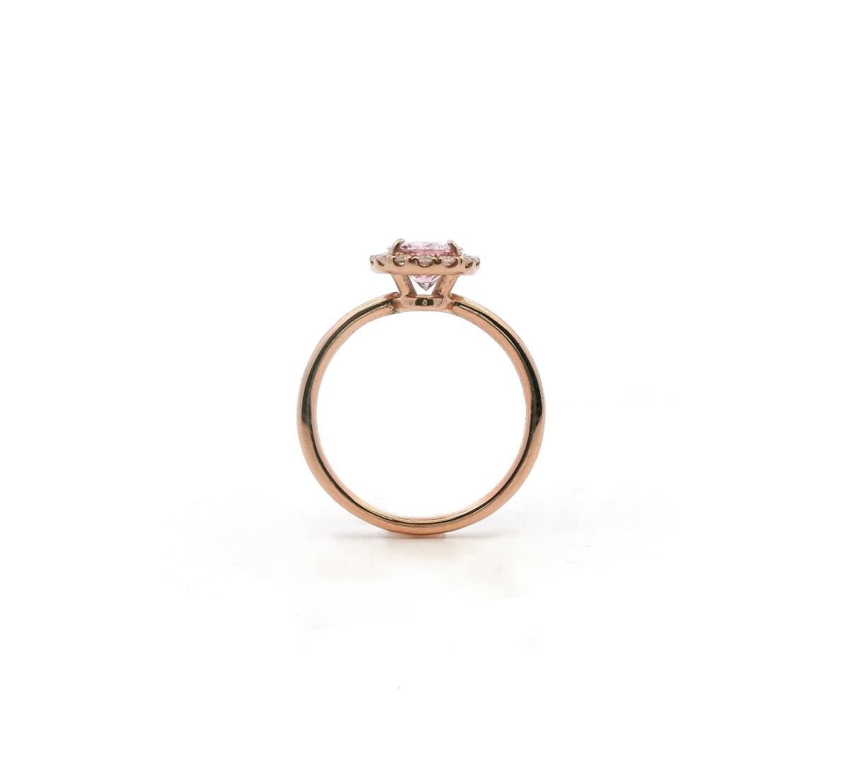 Crafted in 14kt rose gold, this elegant oval halo ring features a 1.02ct natural modified brilliant-cut morganite, prong-set and displaying a light, moderately strong orangy-red color with eye-clean clarity. Surrounding the morganite are 16 prong-set round brilliant-cut diamonds, totaling 0.20ct, with H-I color, VS-2 to SI-1 clarity, and a Very Good cut. The ring's bright polish finish and 1.5mm shank width enhance its timeless and sophisticated appeal. Appraised at $2,350, this beautifully crafted piece is a perfect balance of elegance and brilliance.