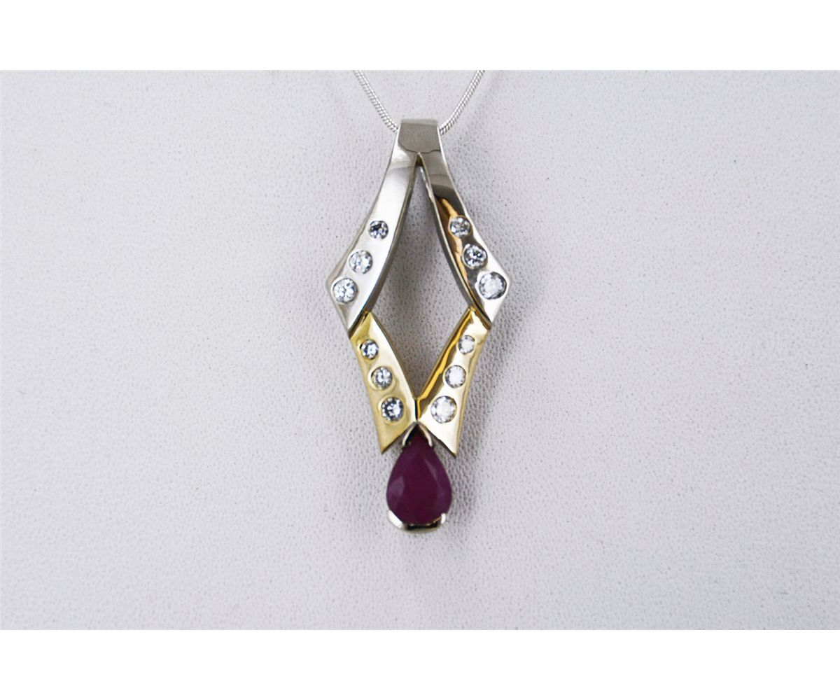 14kt White/Yellow Gold 7.50 approx grams including gems, 1.64ct Natural Ruby Deep (Burma) color Pear Shape .85cttw Round Diamond G-H color VS-SI clarity, big bail, includes Jewelry Appraisal, Appraised Retail Value $5940.00