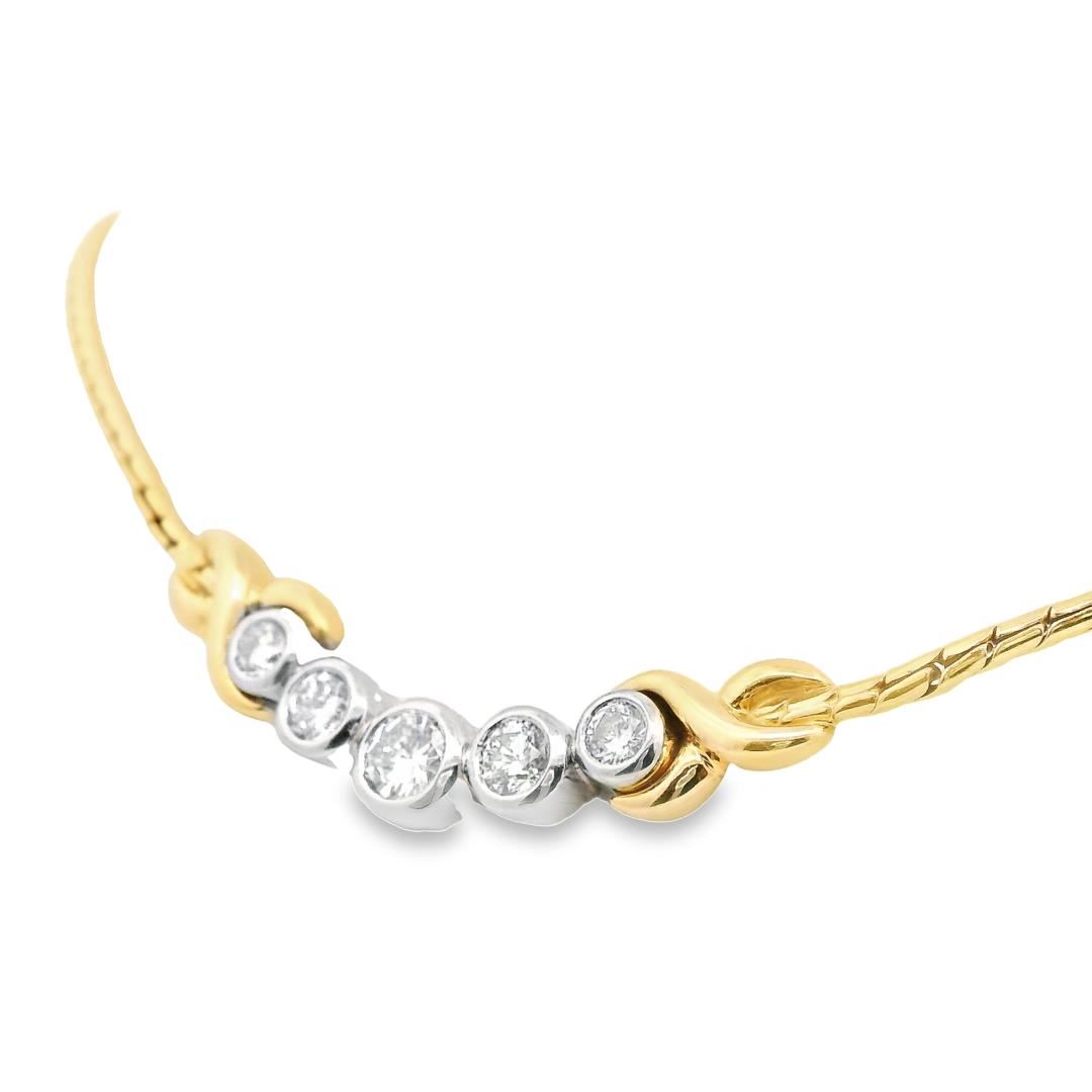 This elegant 14KT yellow and white gold necklace features a half-round wheat link chain measuring 17.5 inches. The centerpiece consists of five bezel-set round brilliant-cut diamonds, including a central diamond weighing 0.36ct, flanked by additional diamonds totaling 1.03ct. The combination of polished metals and well-matched stones creates a balanced and refined design.
