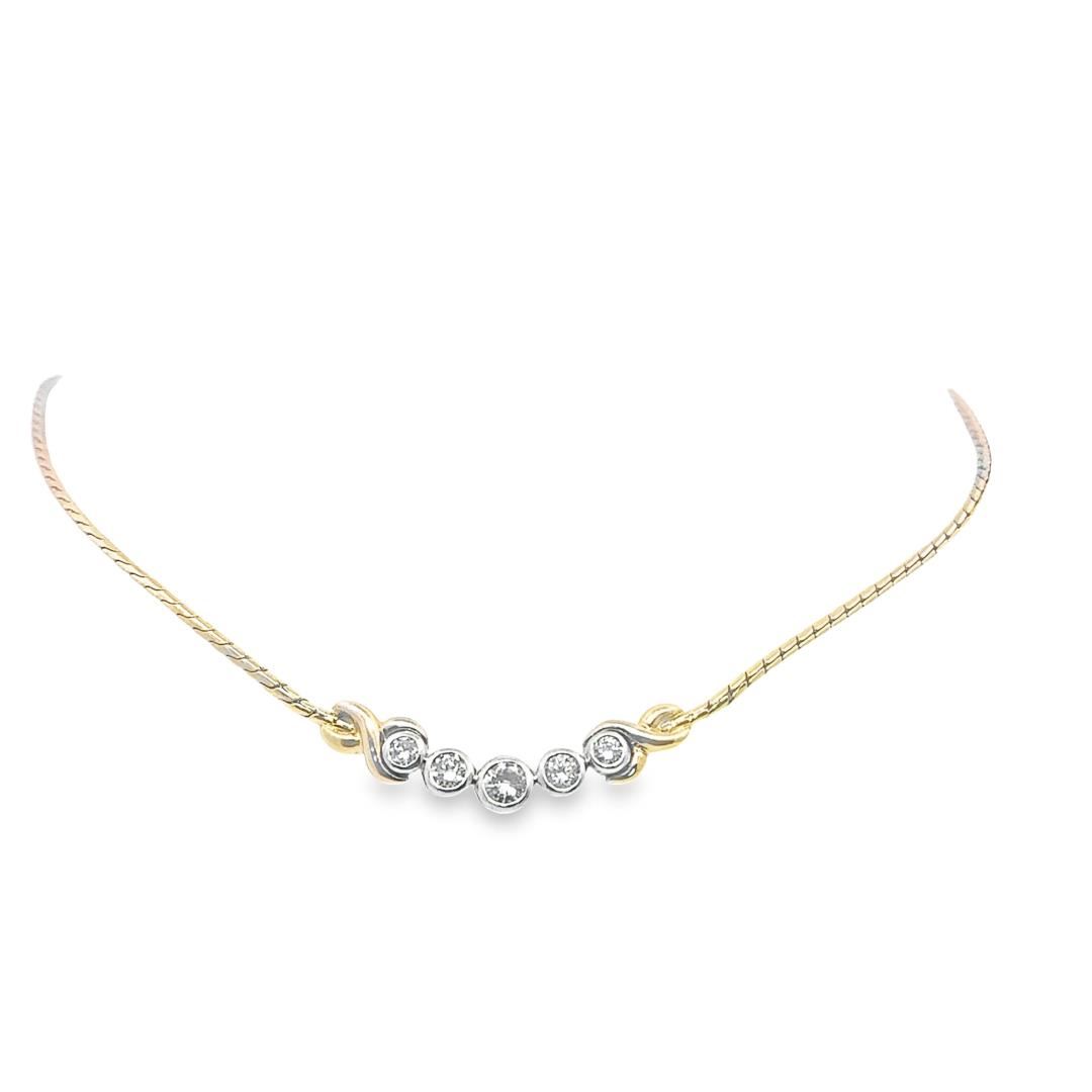 This elegant 14KT yellow and white gold necklace features a half-round wheat link chain measuring 17.5 inches. The centerpiece consists of five bezel-set round brilliant-cut diamonds, including a central diamond weighing 0.36ct, flanked by additional diamonds totaling 1.03ct. The combination of polished metals and well-matched stones creates a balanced and refined design.