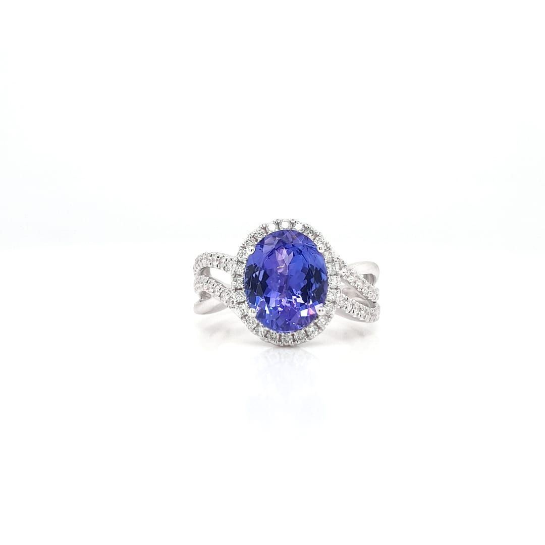 14kt White Gold Ring with Tanznite in Center and Full Cut Round Diamond in a "Halo" setting with intertwined Band with Diamonds half way.