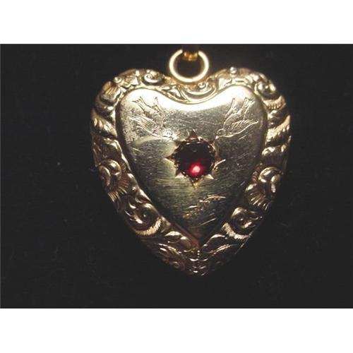 THIS BEAUTIFUL 14kt YELLOW GOLD HEART SHAPED VICTORIAN LOCKET IS BEAUTIFULLY ENGRAVED. IT HAS A GARNET IN THE MIDDLE. THIS BEAUTIFUL LOCKET ON CHAIN IS BROUGHT TO YOU BY TASMARIE.
