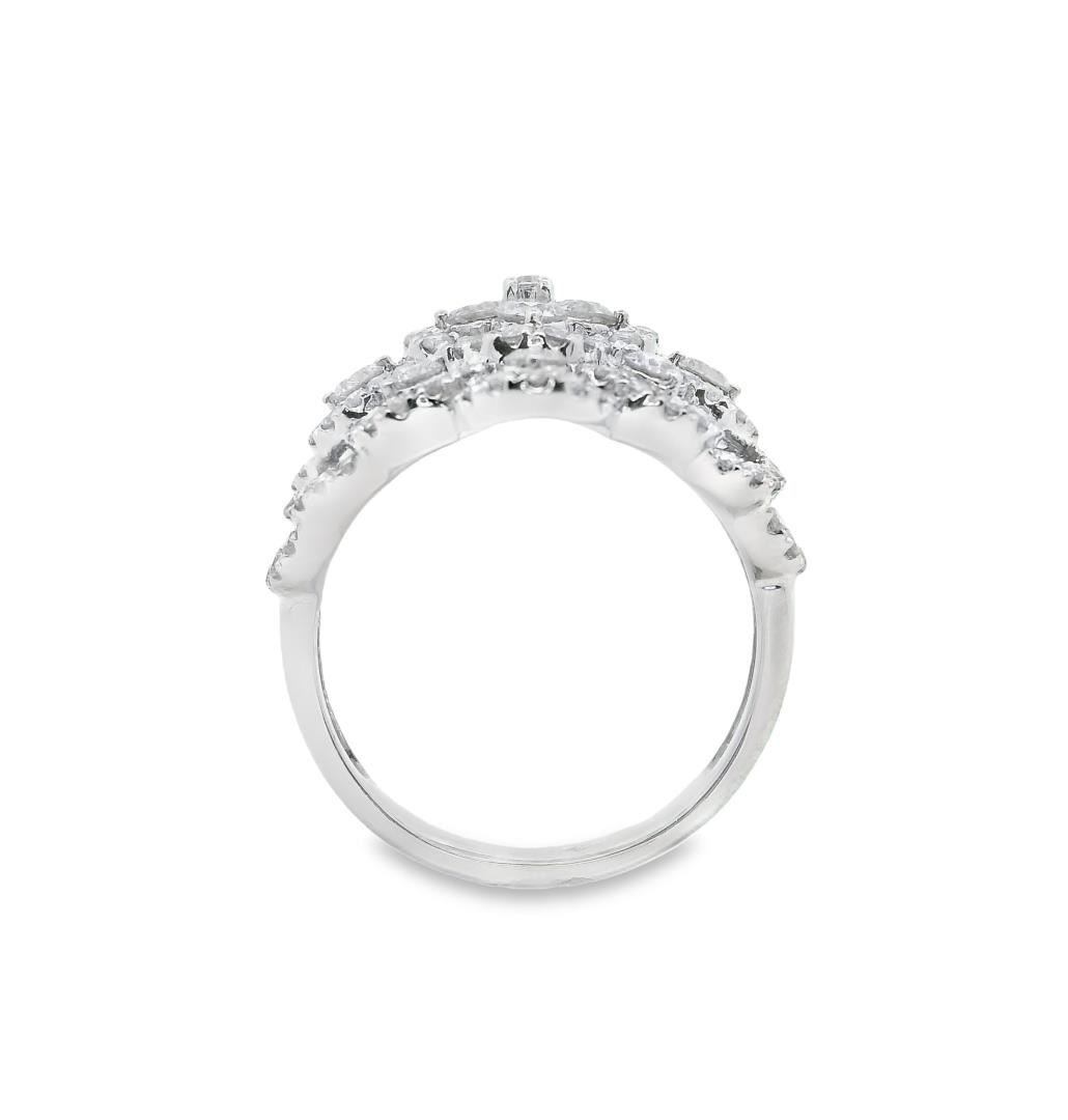 Crafted in 14kt white gold, this fashion designer ring features a floral cluster dome motif with a bright polish finish and a 2.80mm shank width. It is adorned with 132 prong-set round brilliant-cut diamonds, totaling 1.50ct, with G-H color and clarity ranging from VS-2 to SI-2, all graded Very Good cut. The intricate design showcases four larger diamonds (0.40ct total), eight medium diamonds (0.40ct total), and 120 smaller diamonds (0.70ct total) for a dazzling display of brilliance. This elegant statement piece is expertly crafted for a refined and luxurious look.