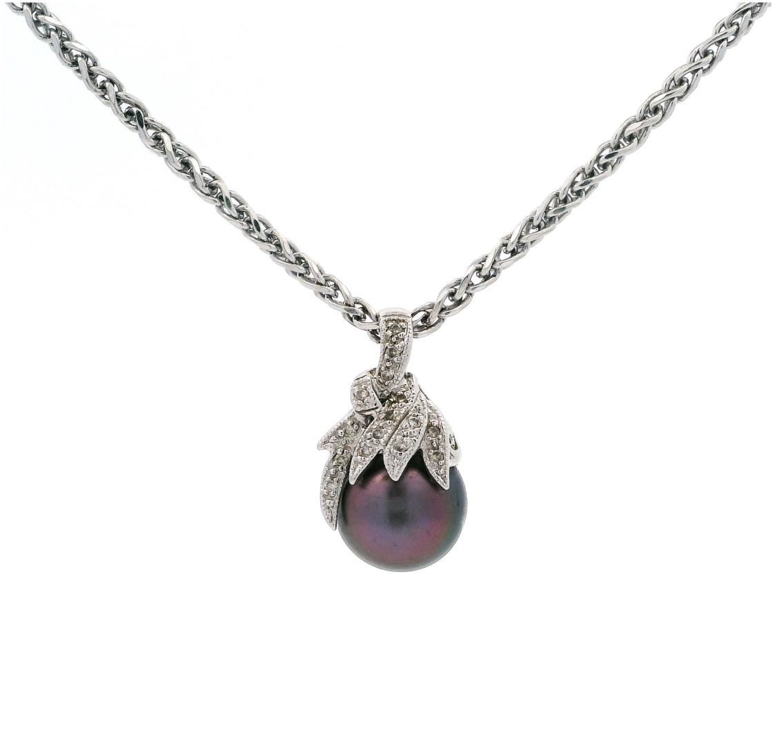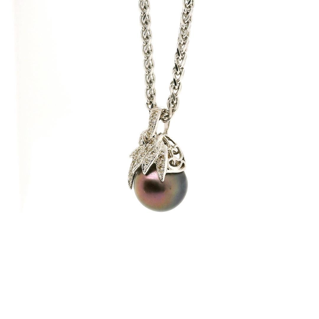 This 14KT white gold necklace features a black South Sea cultured pearl measuring 11.0mm with a green overtone and high luster. It is accented by fifteen prong-set round brilliant cut diamonds totaling 0.10ct, with H-I color and SI-1 to SI-2 clarity. The necklace weighs 14.30 grams and has a floral motif with milgrain detailing.