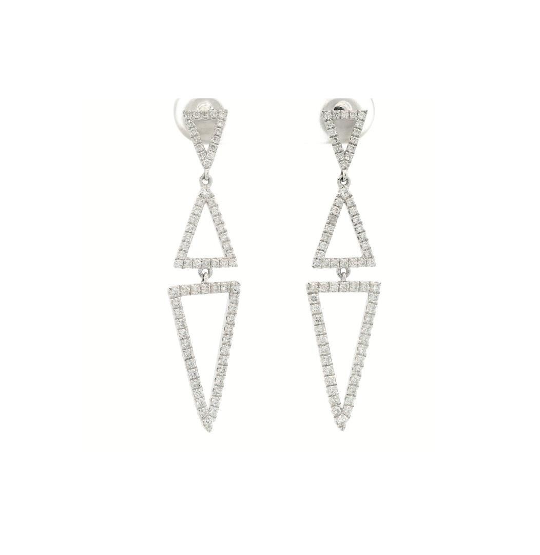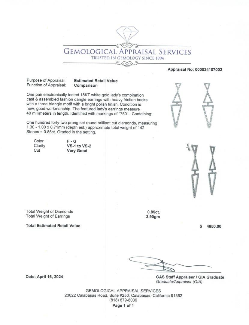 Crafted in 18kt white gold, this pair of fashion dangle earrings features a three-triangle motif with a bright polish finish and secure heavy friction backs. Measuring 40mm in length, these earrings are adorned with 142 prong-set round brilliant-cut diamonds, totaling 0.85ct, with F-G color, VS-1 to VS-2 clarity, and a Very Good cut. The intricate geometric design enhances their modern elegance, making them a striking addition to any jewelry collection.