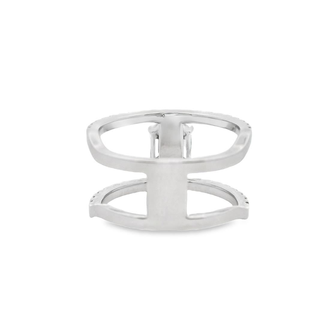 Crafted in 14kt white gold, this fashion ring features a double wide band with a bright polish finish and a shank measuring 8.40mm in width. The centerpiece is an invisible-set emerald cut cluster diamond, measuring 7.50 x 5.95mm, with a total weight of 0.65ct, graded G-H in color, VS-1 to VS-2 in clarity, and Excellent cut. Accentuating the design are 42 prong-set round brilliant-cut diamonds, totaling 0.50ct, with G-H color, VS-2 to SI-1 clarity, and an Excellent cut. This bold and sophisticated ring showcases exceptional craftsmanship and refined elegance.
