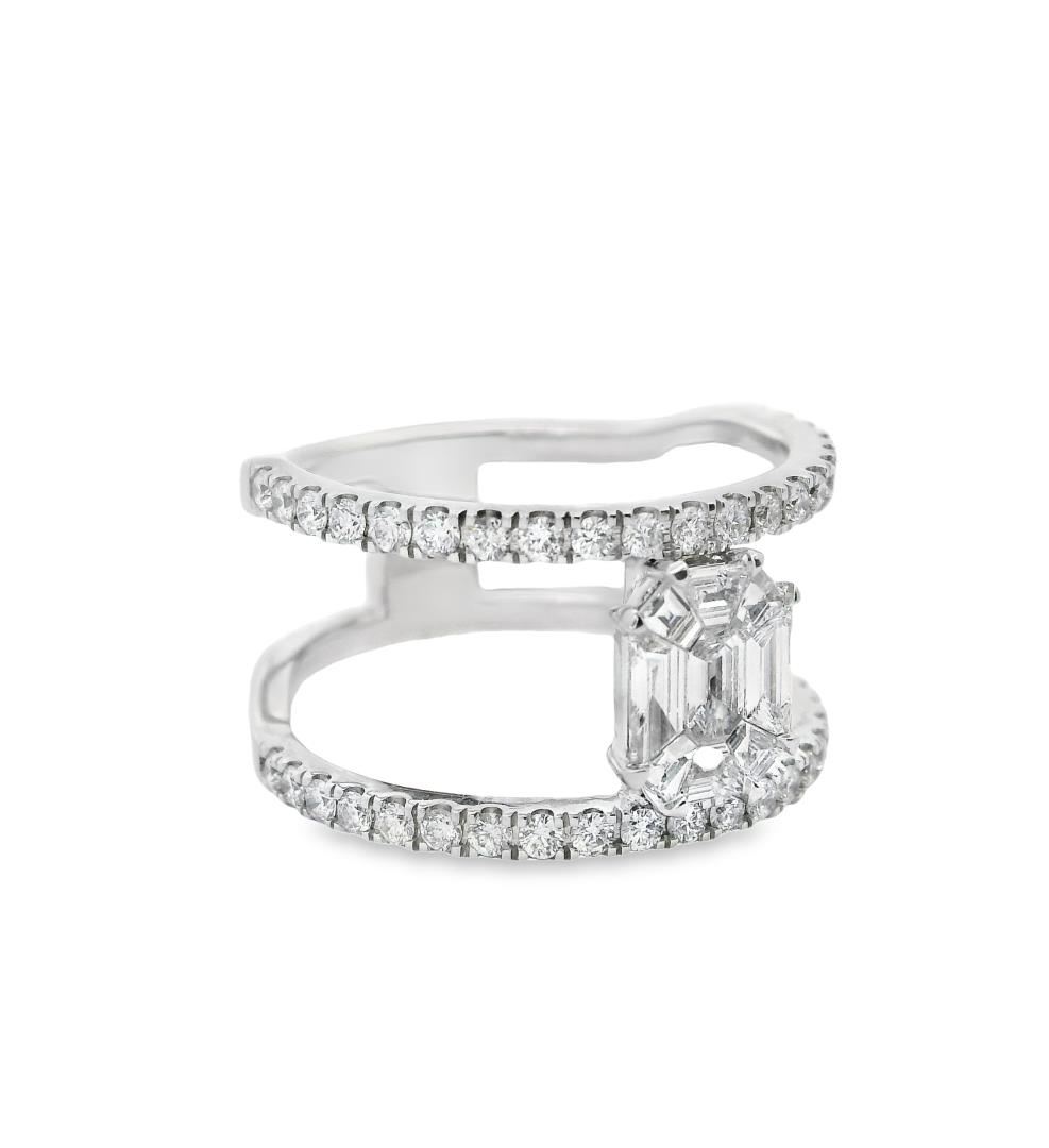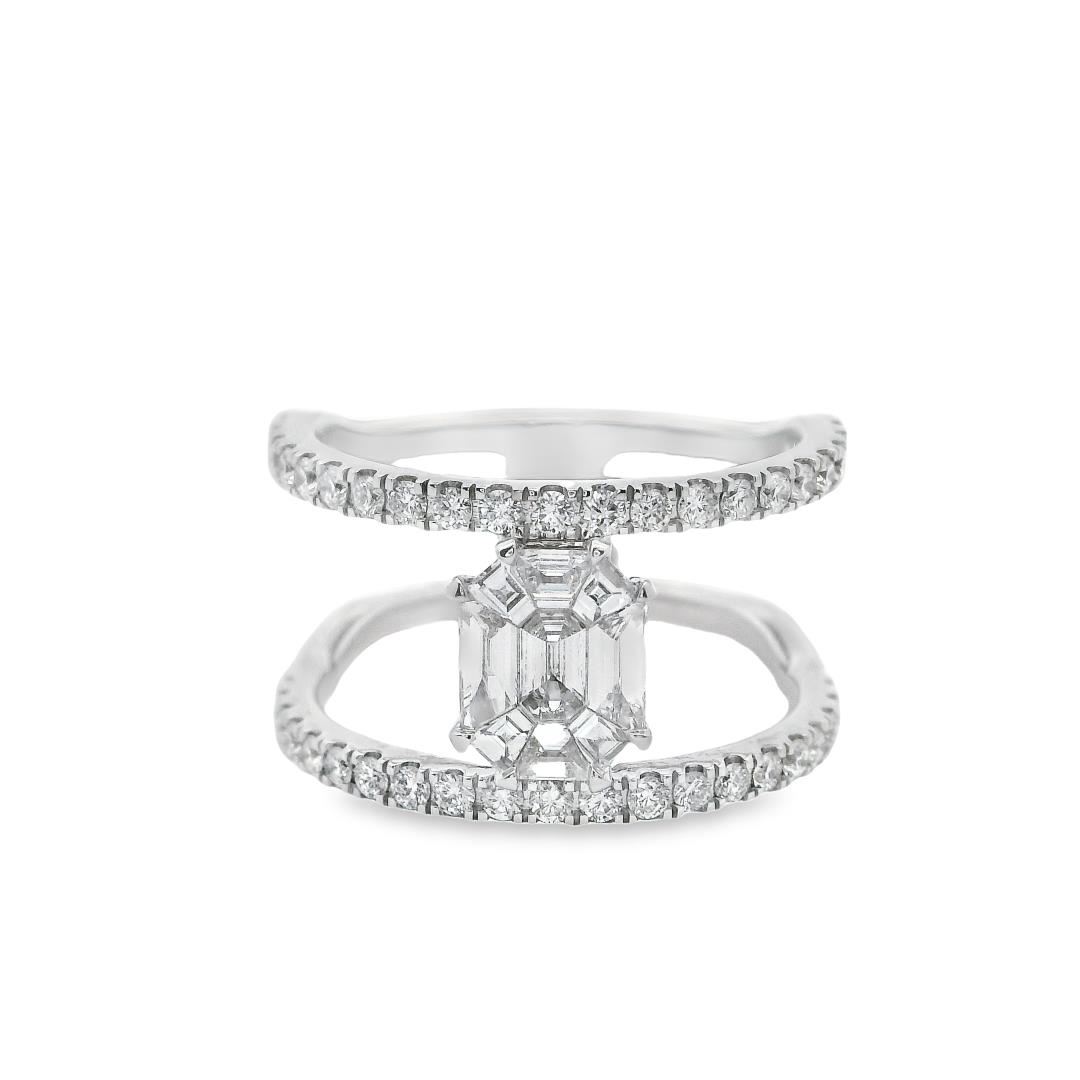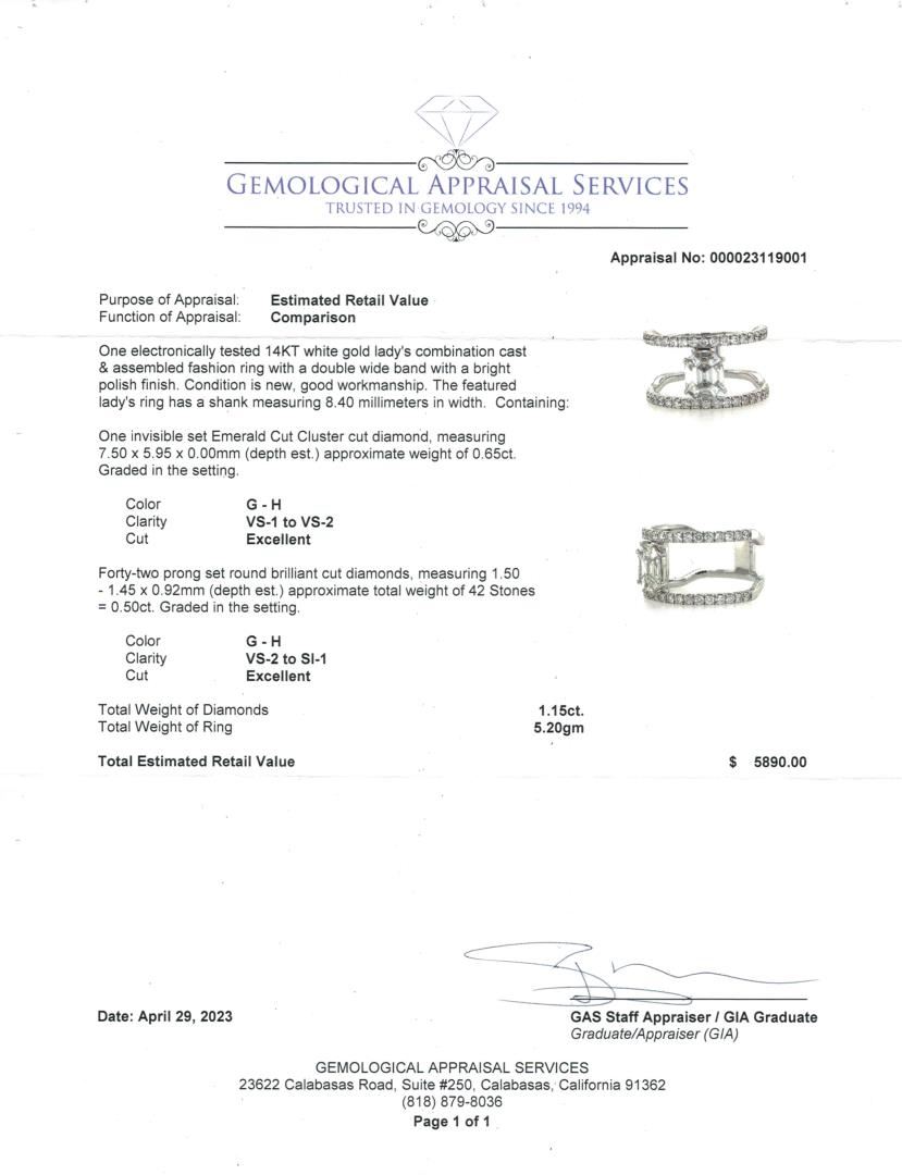 Crafted in 14kt white gold, this fashion ring features a double wide band with a bright polish finish and a shank measuring 8.40mm in width. The centerpiece is an invisible-set emerald cut cluster diamond, measuring 7.50 x 5.95mm, with a total weight of 0.65ct, graded G-H in color, VS-1 to VS-2 in clarity, and Excellent cut. Accentuating the design are 42 prong-set round brilliant-cut diamonds, totaling 0.50ct, with G-H color, VS-2 to SI-1 clarity, and an Excellent cut. This bold and sophisticated ring showcases exceptional craftsmanship and refined elegance.