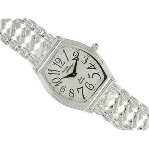 14kt white gold round cabochon sapphire cushion white face ladies quartz watch. this watch measures 1 inch in width with a hidden box clasp. it has swiss quartz movement with a designer band. the sapphire is located at the end of the crown. michael anthony.