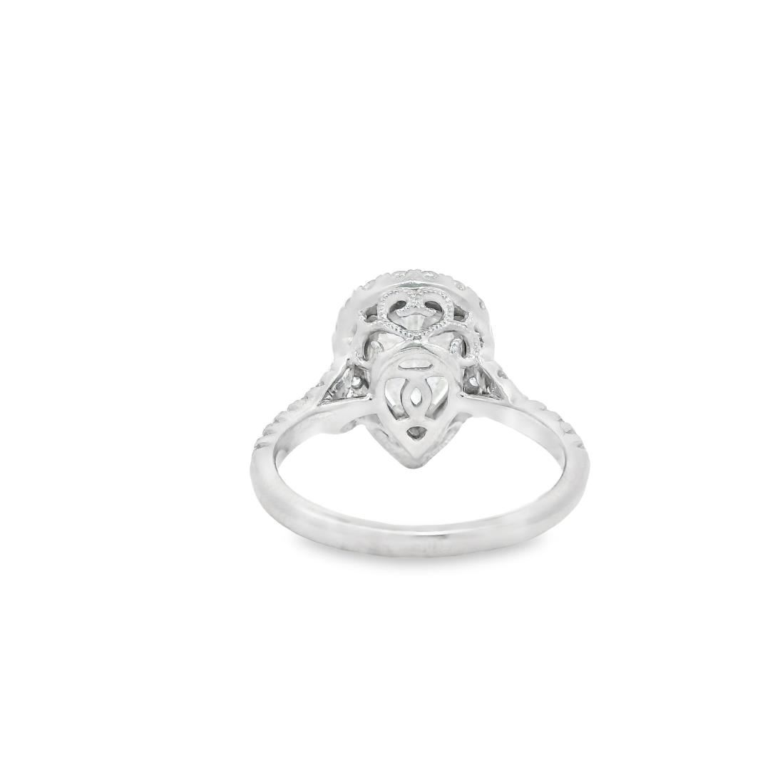 This custom CAD/CAM-designed 14KT white gold wedding ring features a pear-shaped diamond centerpiece weighing 1.68ct. It is complemented by nineteen round brilliant cut diamonds totaling 0.60ct and twenty additional round diamonds totaling 0.25ct. The diamonds range from H-I color, with SI-1 to VS-2 clarity and very good cut quality. The ring weighs 4.10 grams.