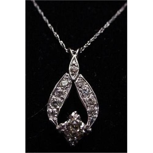 THIS IS A BEAUTIFUL 14kt WHITE GOLD DIAMOND PENDANT AND NECKLACE. IT HAS AN APPROX. .25ct MINE CUT FANCY COLOR YELLOW CAST CENTER DIAMOND AND APPROX. .25ctw SMALL WHITE DIAMONDS. THE PENDANT WEIGHS 2.6g AND THE NECKLACE IS 17". THIS IS ANOTHER BEAUTIFUL PIECE BROUGHT TO YOU BY TASMARIE.