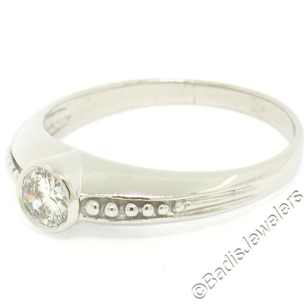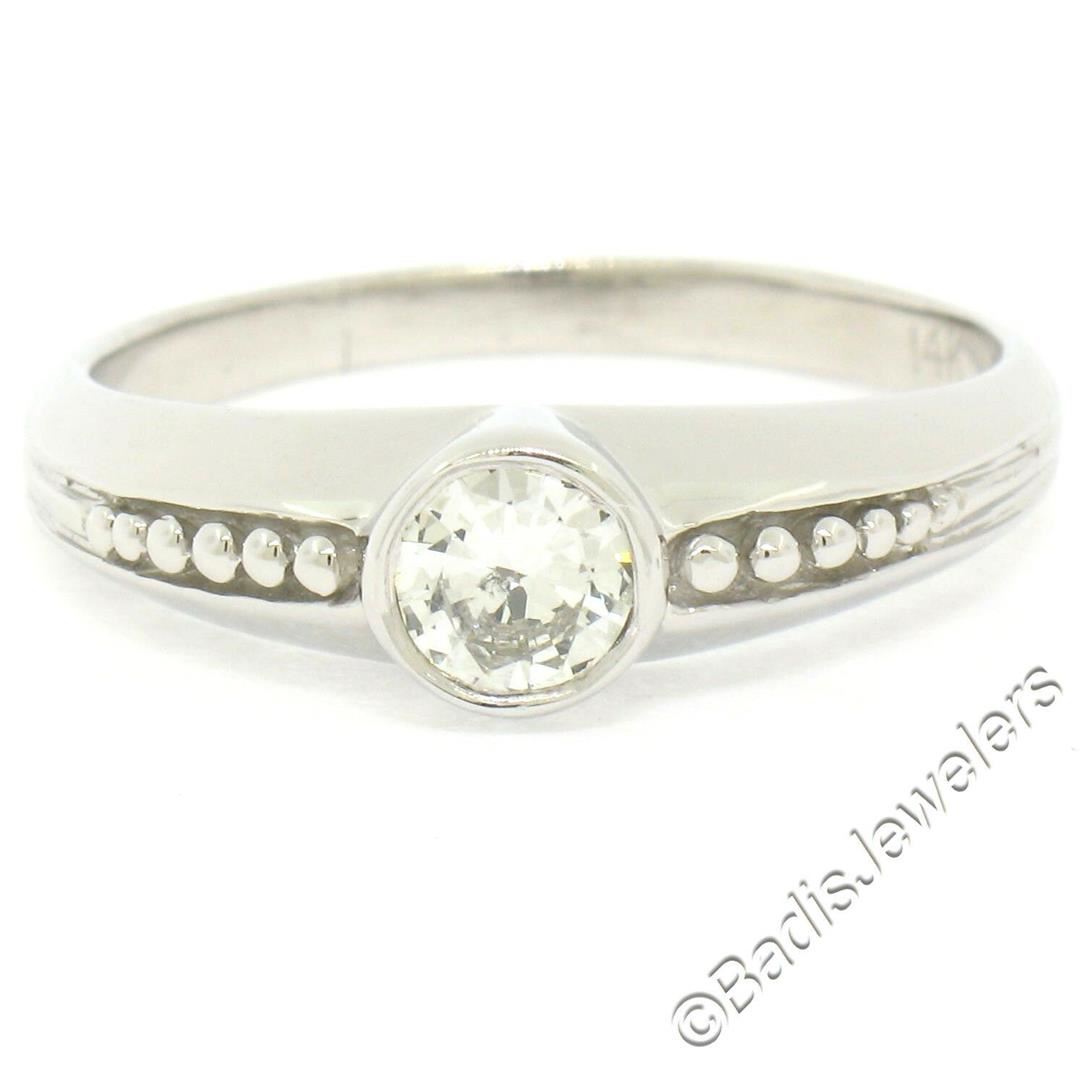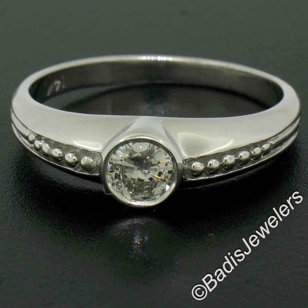 A 14kt white gold solitaire ring featuring a round brilliant diamond (F - SI1; 0.32ct) bezel set at its center accented by a simple beading pattern.The ring is size 9.5, weighs a total of 3.64 grams, and measures 5.9mm wide.