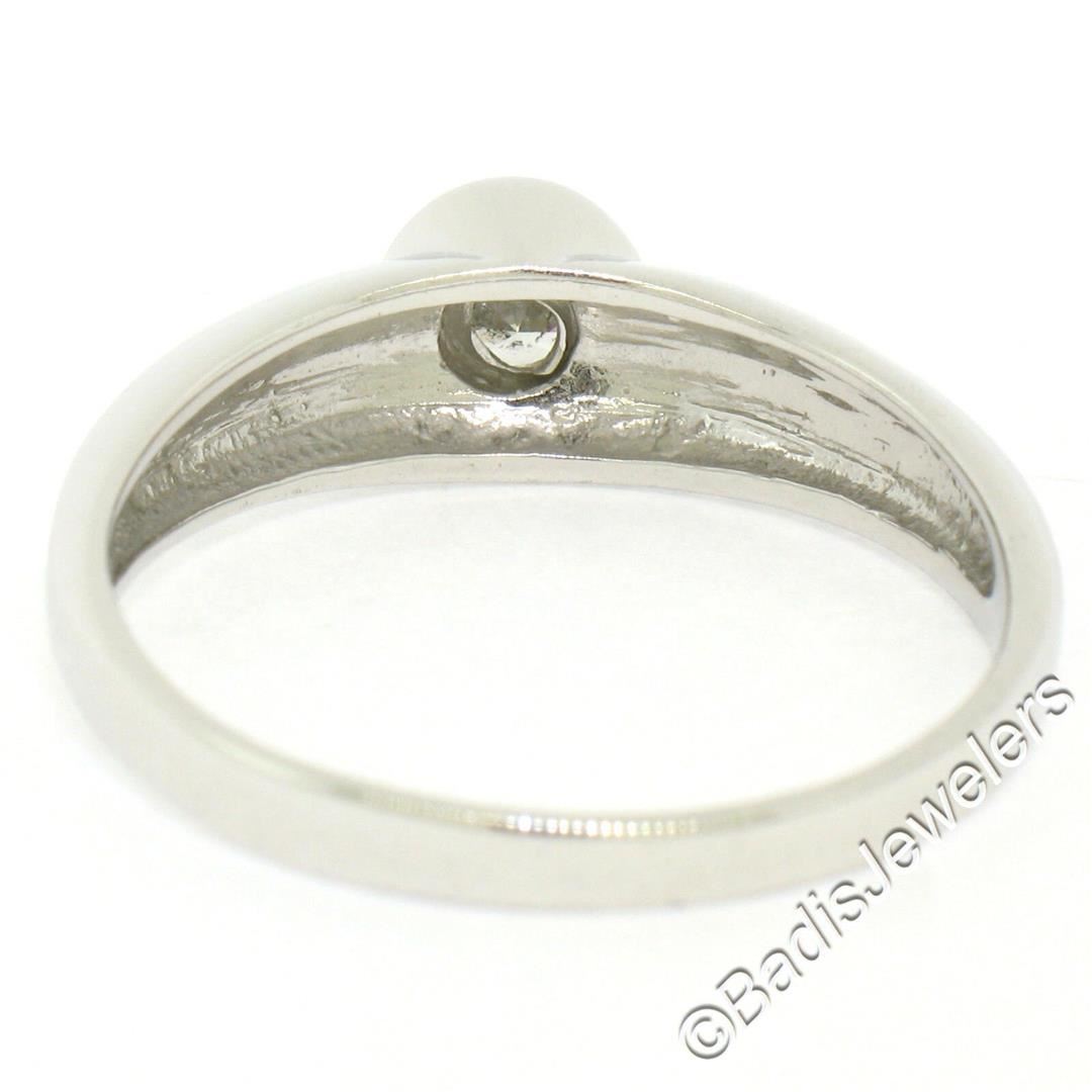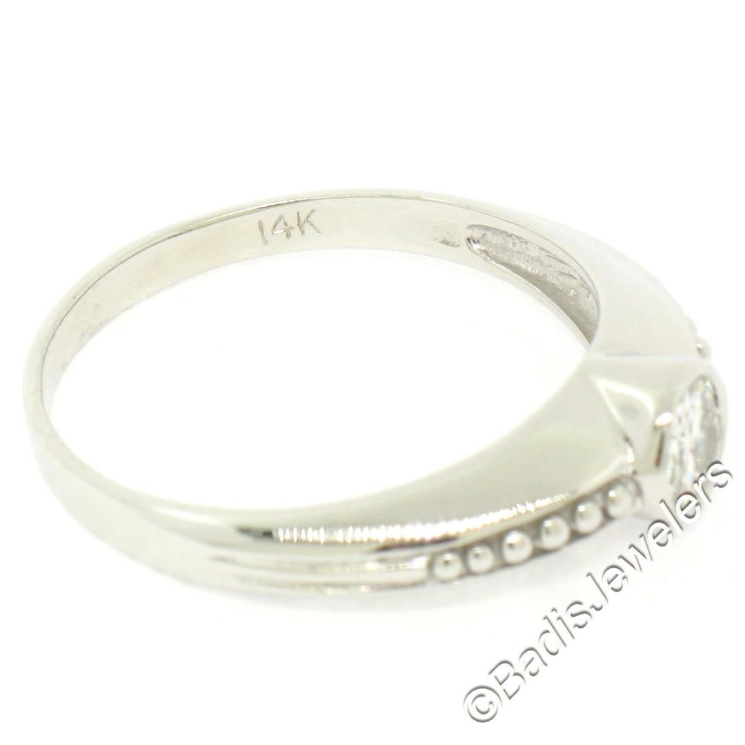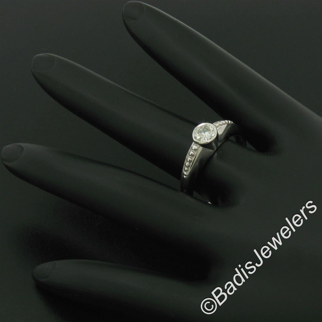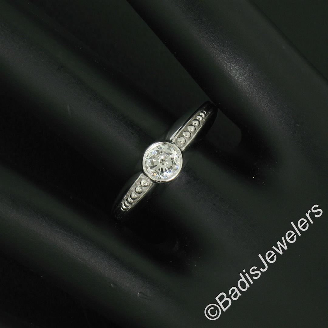 A 14kt white gold solitaire ring featuring a round brilliant diamond (F - SI1; 0.32ct) bezel set at its center accented by a simple beading pattern.The ring is size 9.5, weighs a total of 3.64 grams, and measures 5.9mm wide.