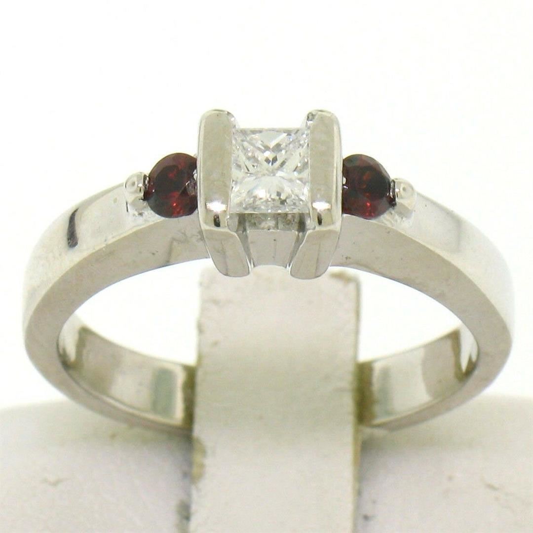 A 14kt white gold engagement ring featuring a 0.25ct channel set princess cut diamond (F - VS1) flanked by 2 round brilliant garnets. The ring is size 5.0, weighs a total of 3.9 grams, and measures 5.16mm wide.