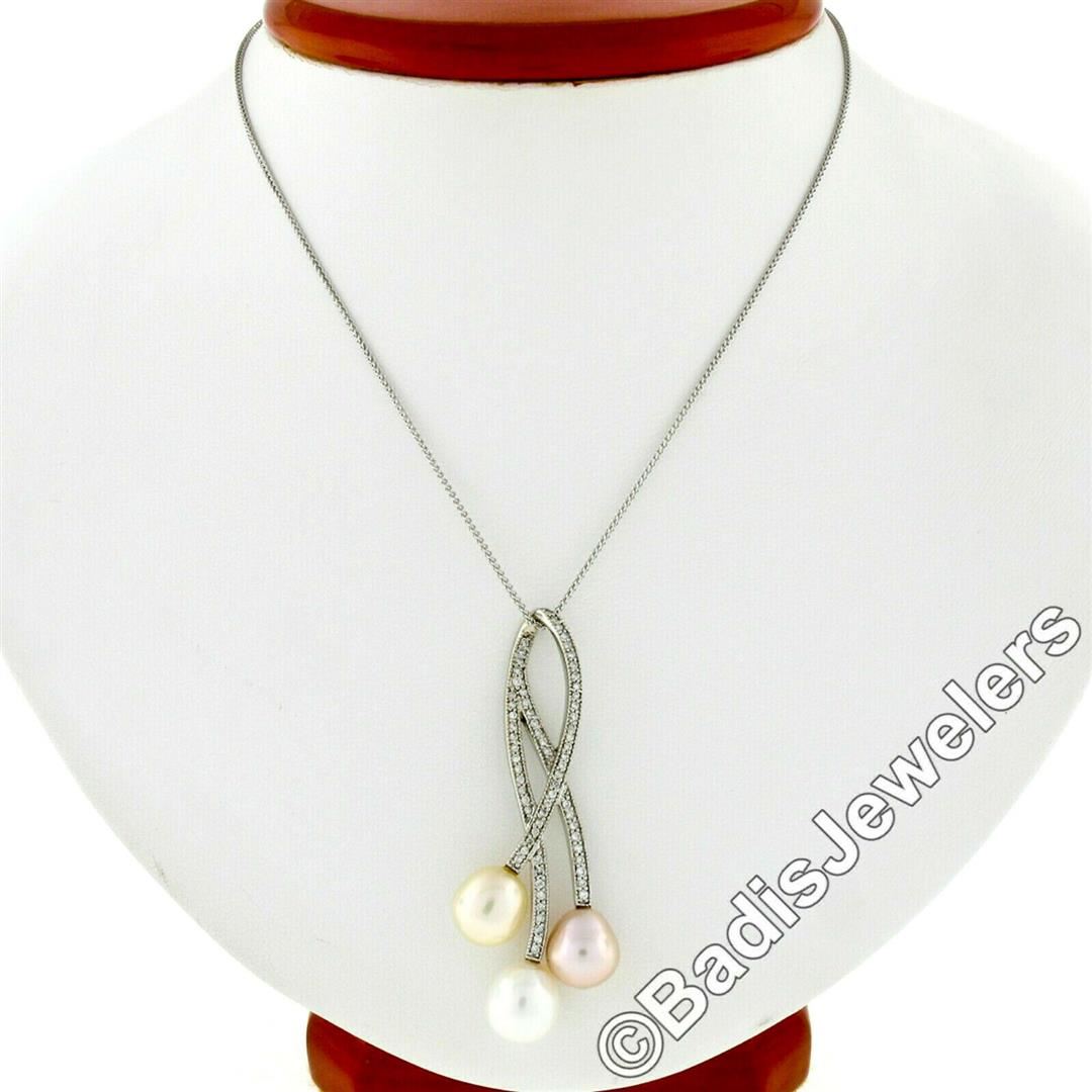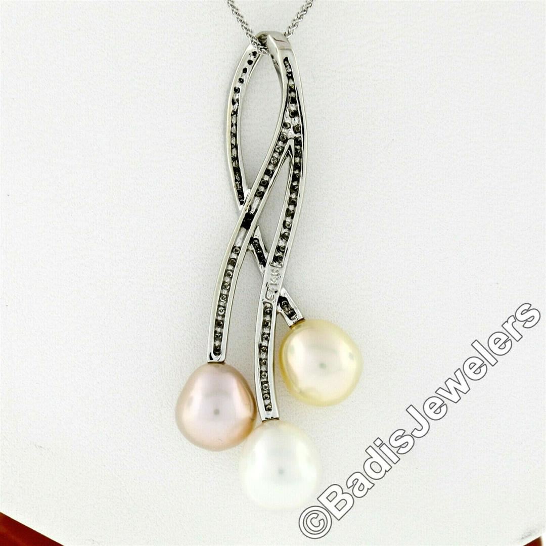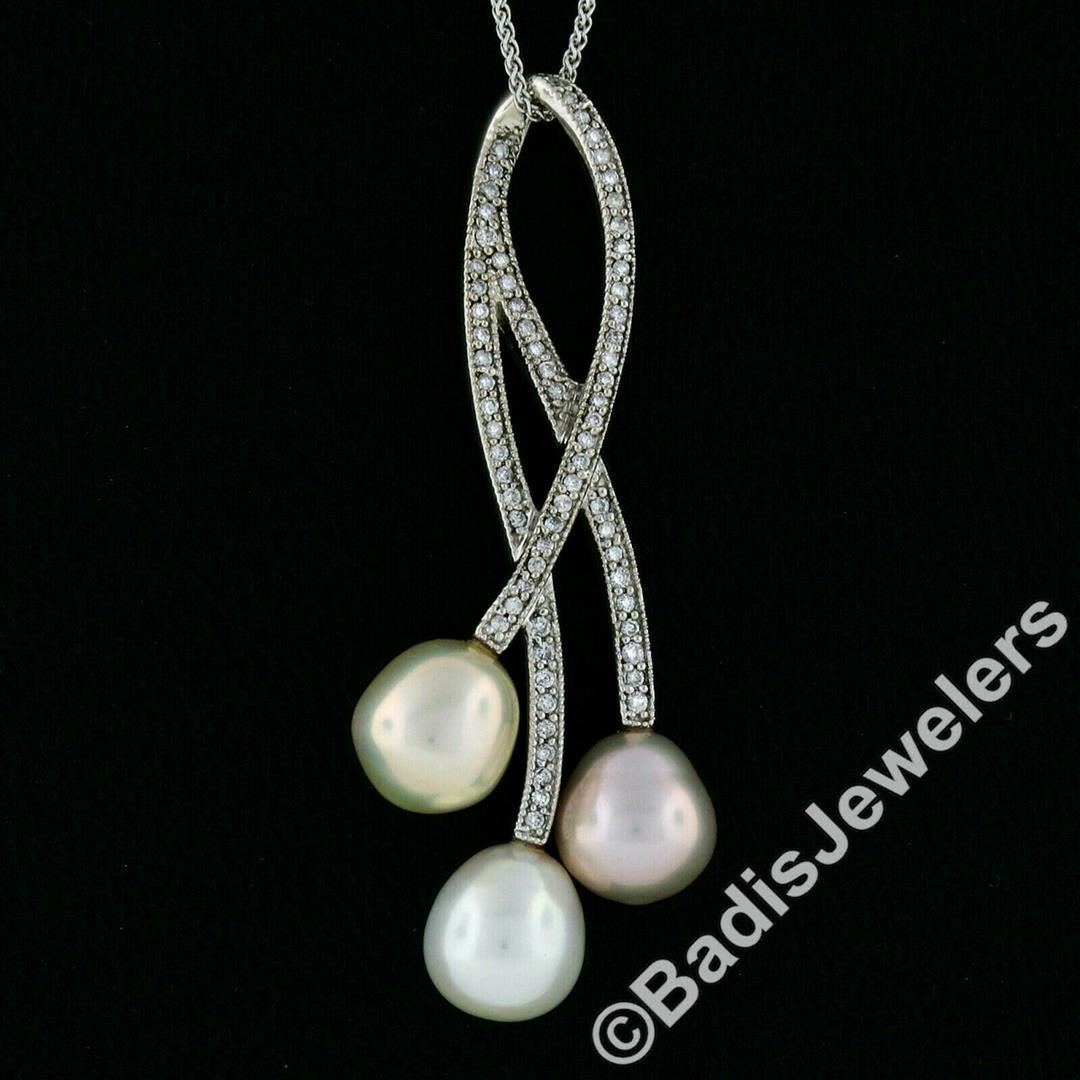 A 14kt white gold pendant necklace featuring 3 cultured pearls and 69 round brilliant diamonds (H/I - VS2/SI1; 0.55ctw). 18 inch wheat link chain, 9.51 grams total weight, pendant measures 53.4x20.5mm.