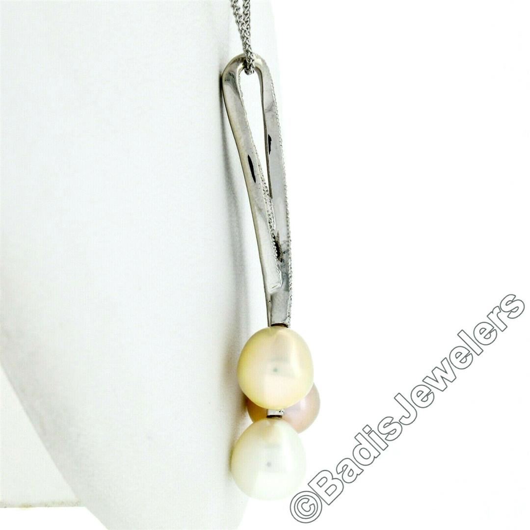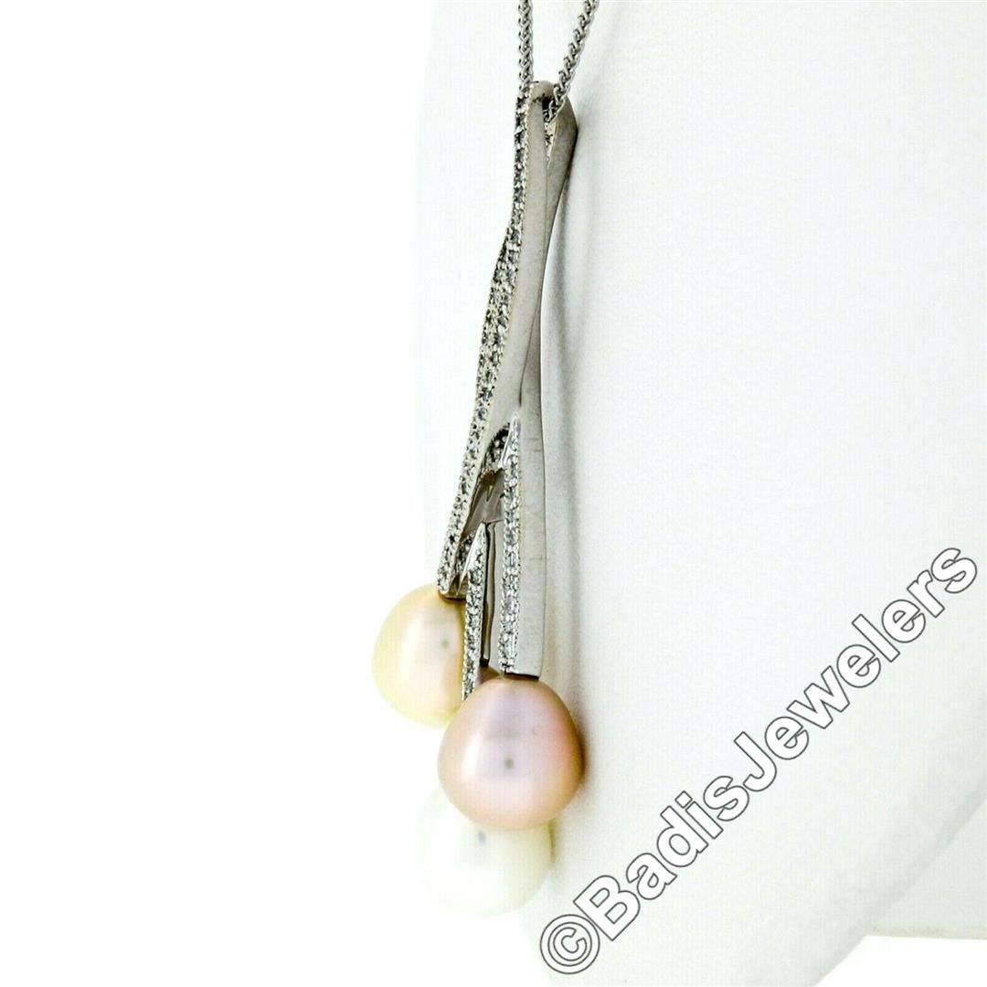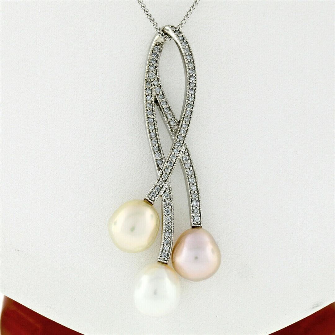 A 14kt white gold pendant necklace featuring 3 cultured pearls and 69 round brilliant diamonds (H/I - VS2/SI1; 0.55ctw). 18 inch wheat link chain, 9.51 grams total weight, pendant measures 53.4x20.5mm.