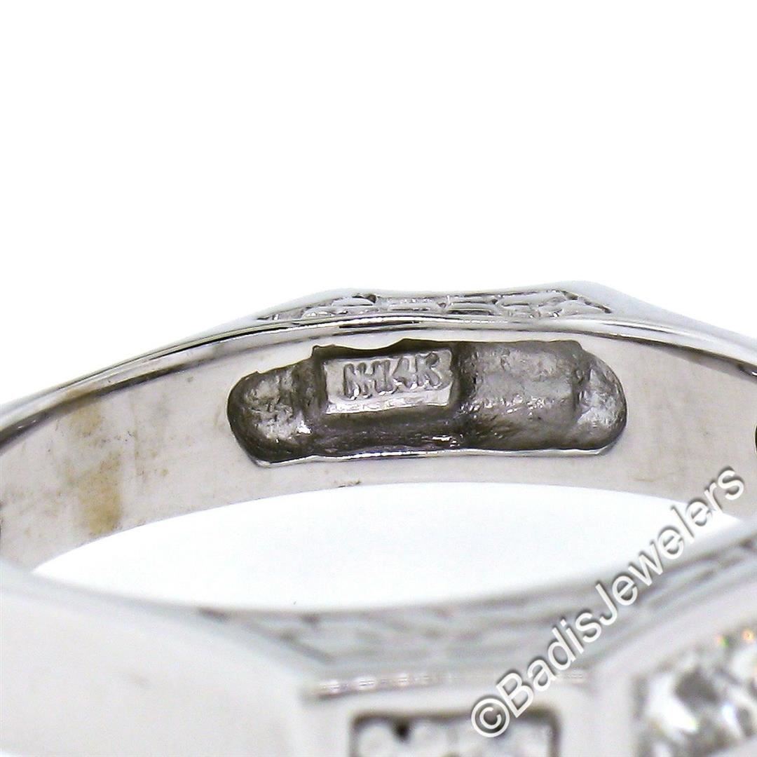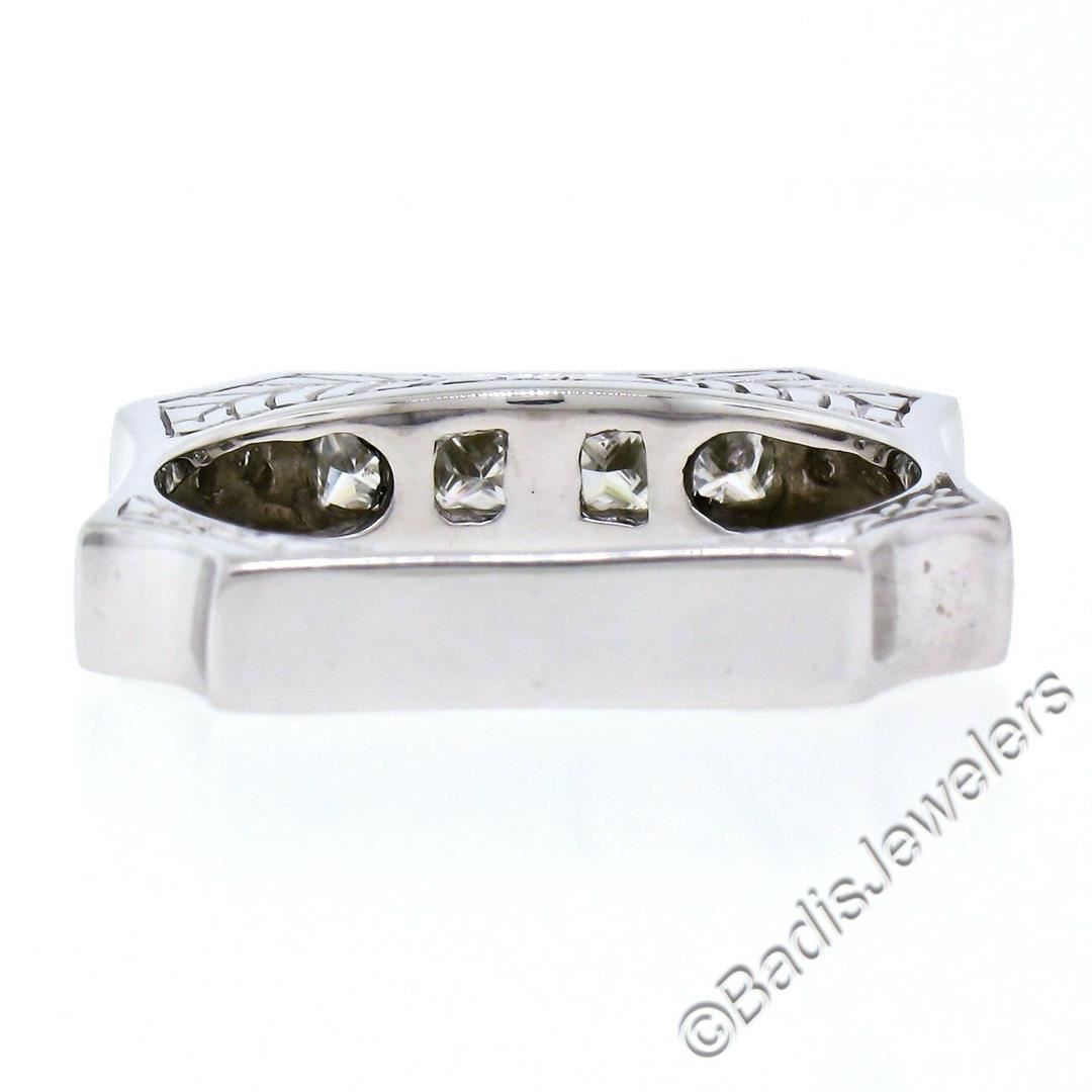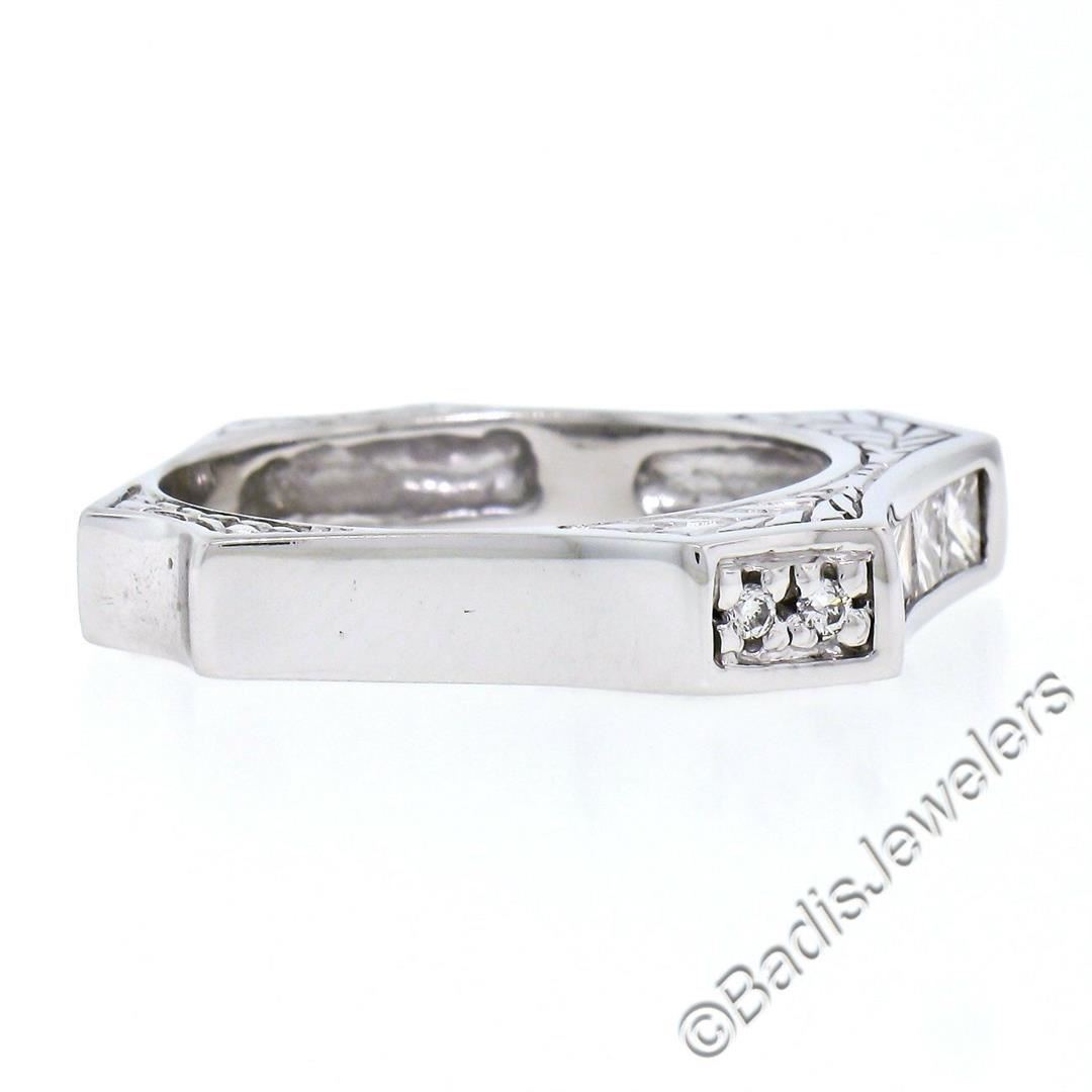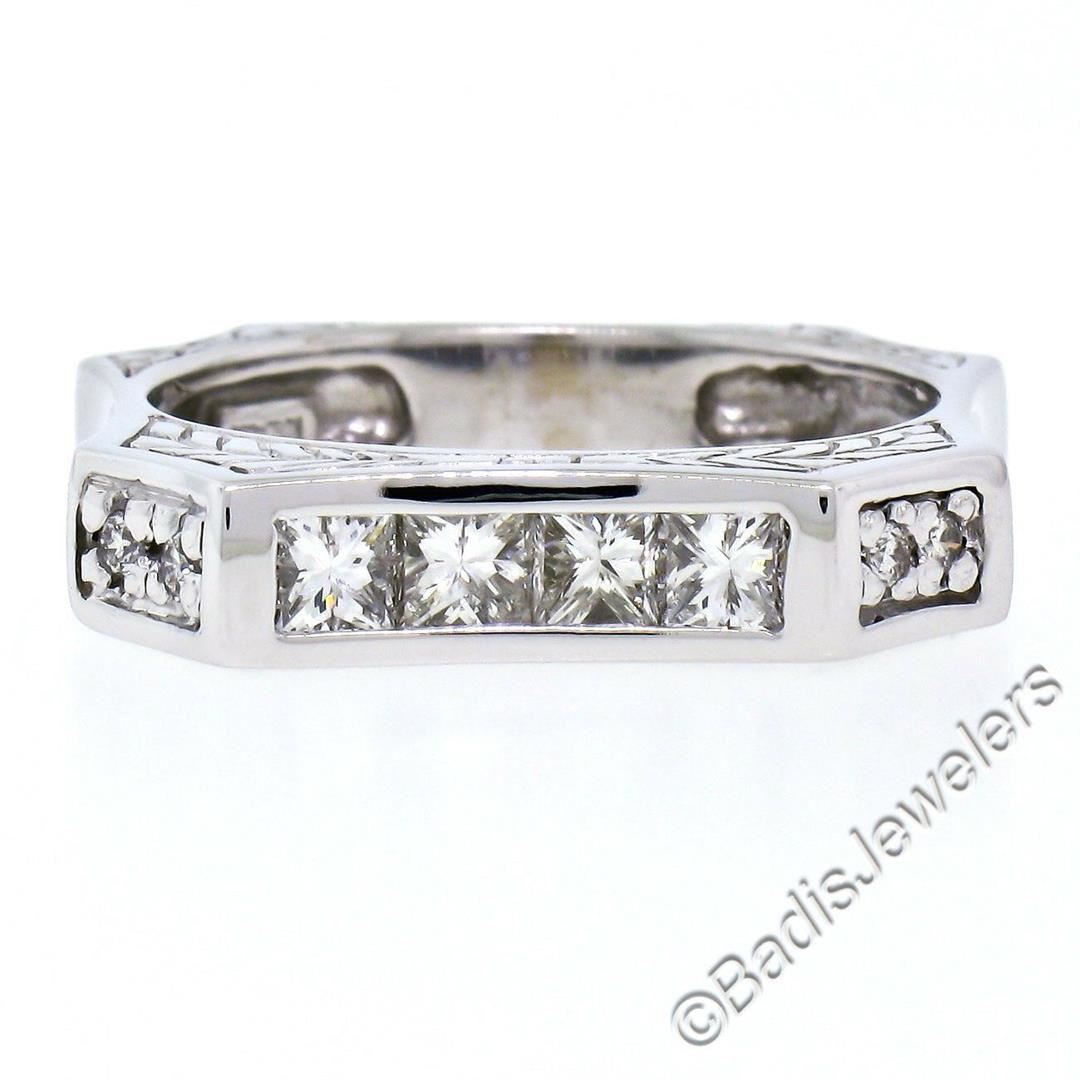 An excellent condition 14kt white gold band ring with 0.71ctw of round and princess cut diamonds (G/H - VS1/VS2). The ring is size 9, weighs a total of 6.65 grams, and measures approximately 4.60mm wide.