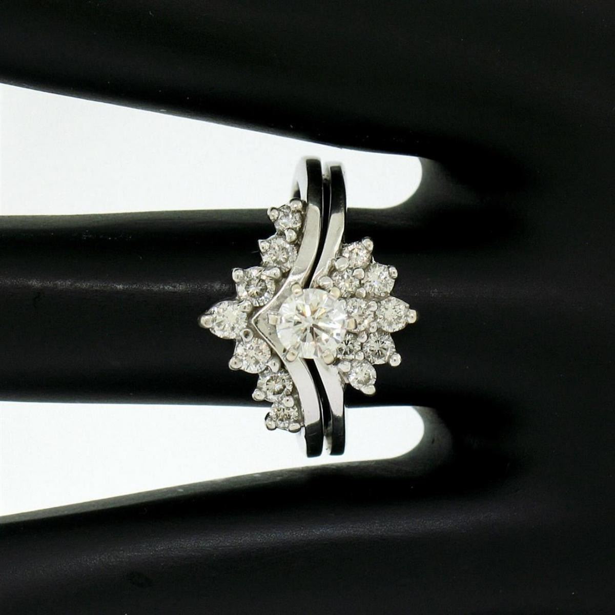 A 14kt white gold cluster ring featuring a 0.40ct round brilliant diamond (G - VS2) prong set at its center among 0.60ctw of smaller round brilliant diamonds (F/G - VS1/VS2). The ring is size 7.0, weighs a total of 6.41 grams, and measures 14.68mm wide.