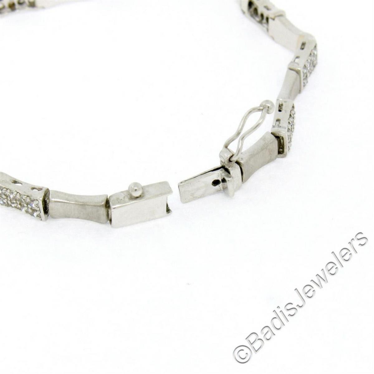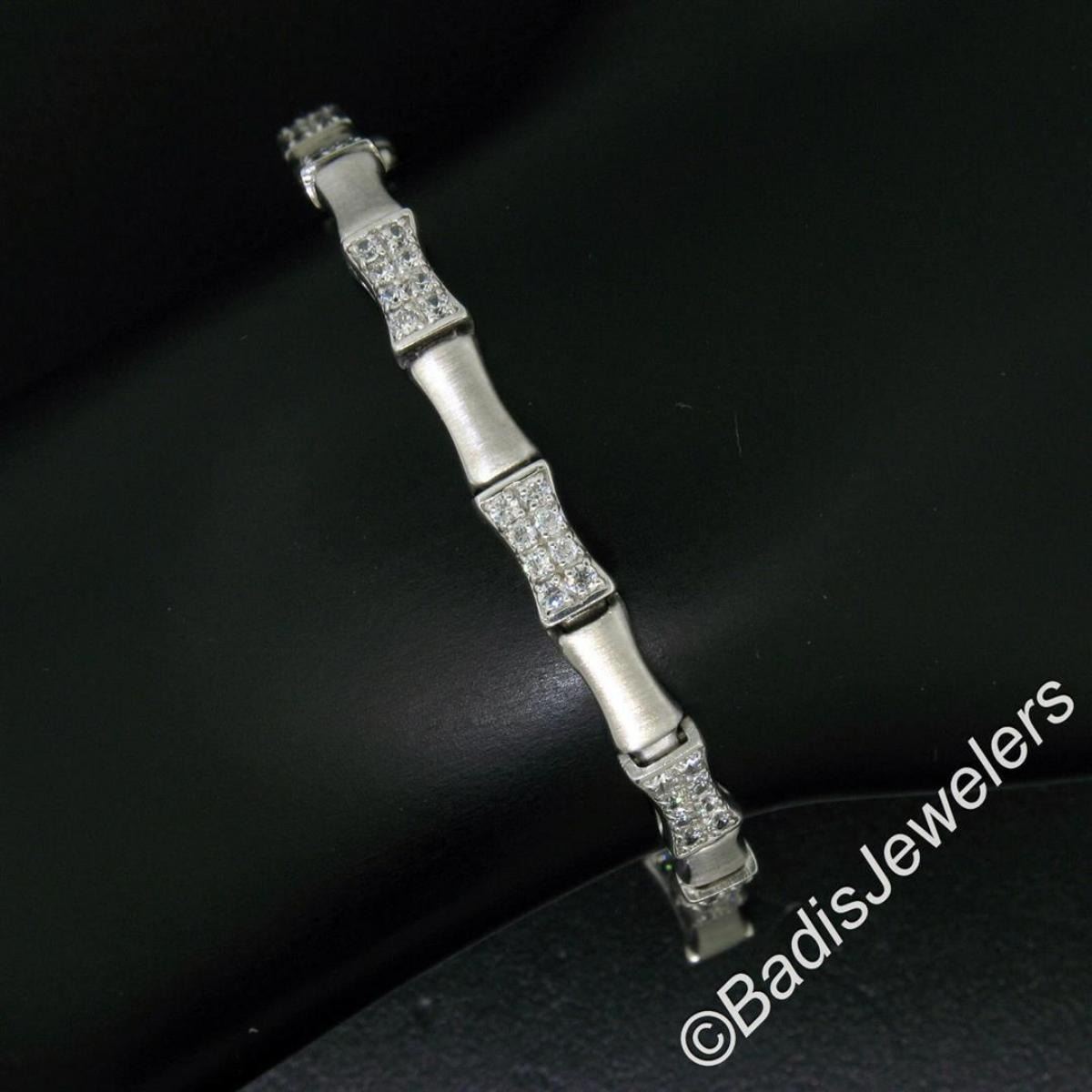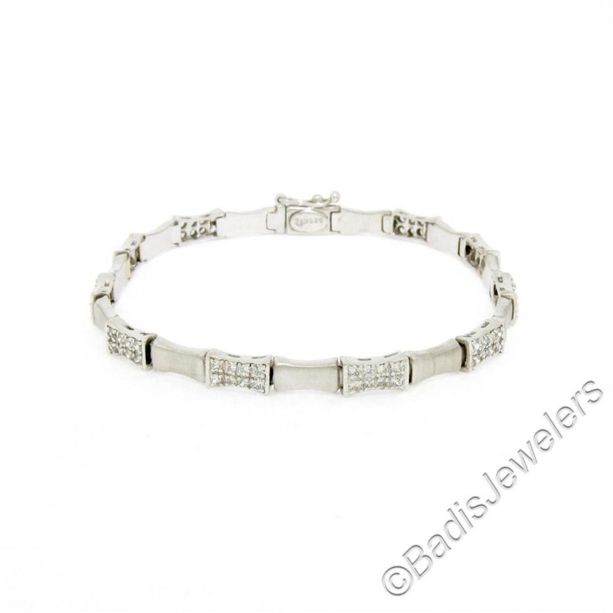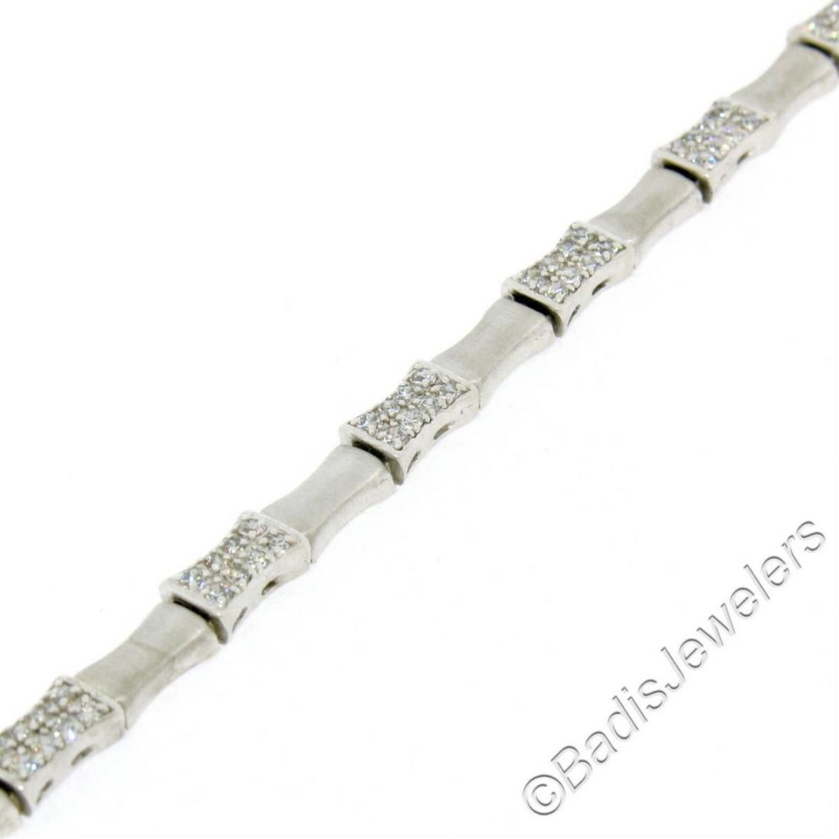 A like new 14kt white gold chain bracelet with 1.20ctw of round diamonds (F/G - VS1/VS2) set into stations which alternate with finely brushed concave links. It weighs a total of 10.71 grams, measures 5.0mm wide, and measures 7.5 inches long.