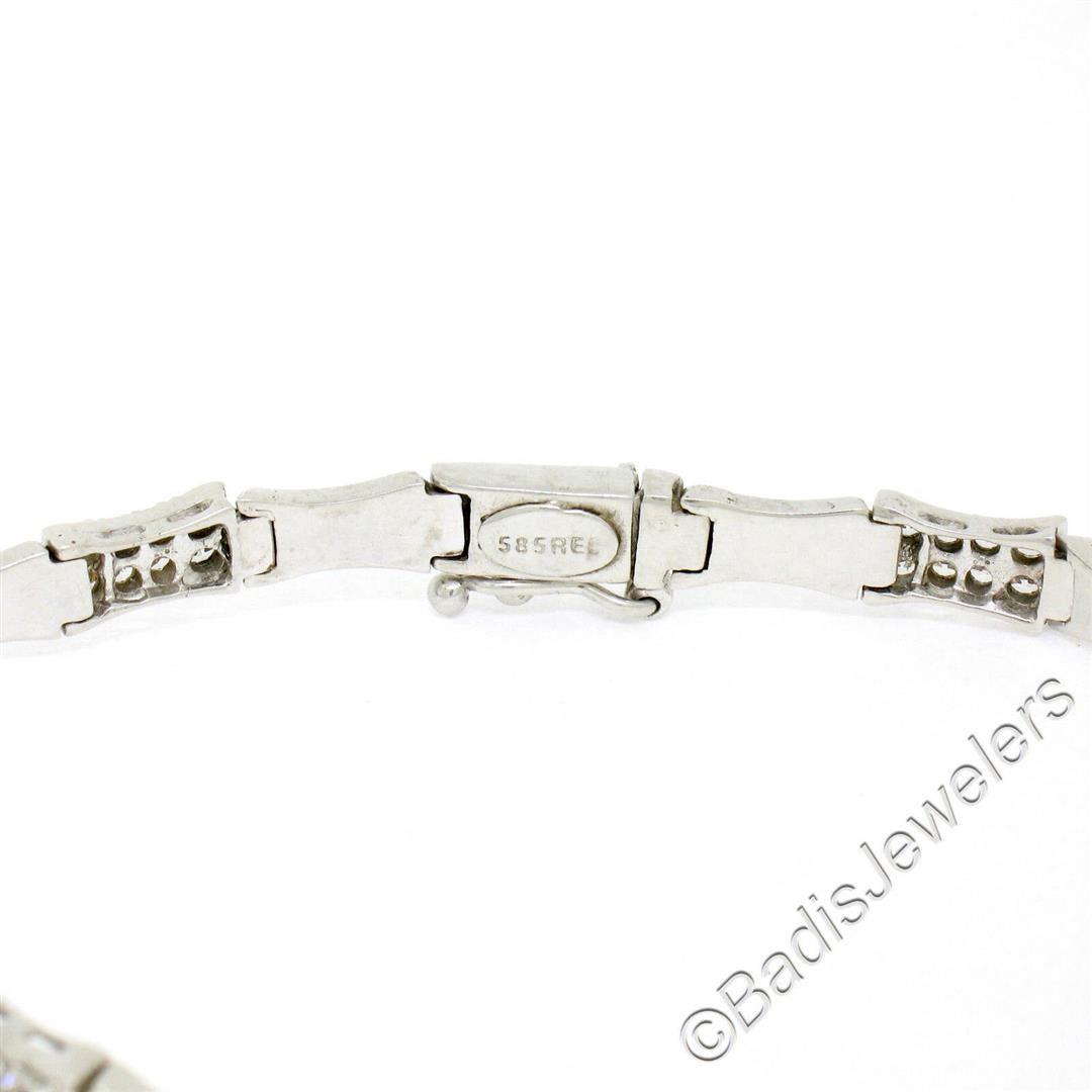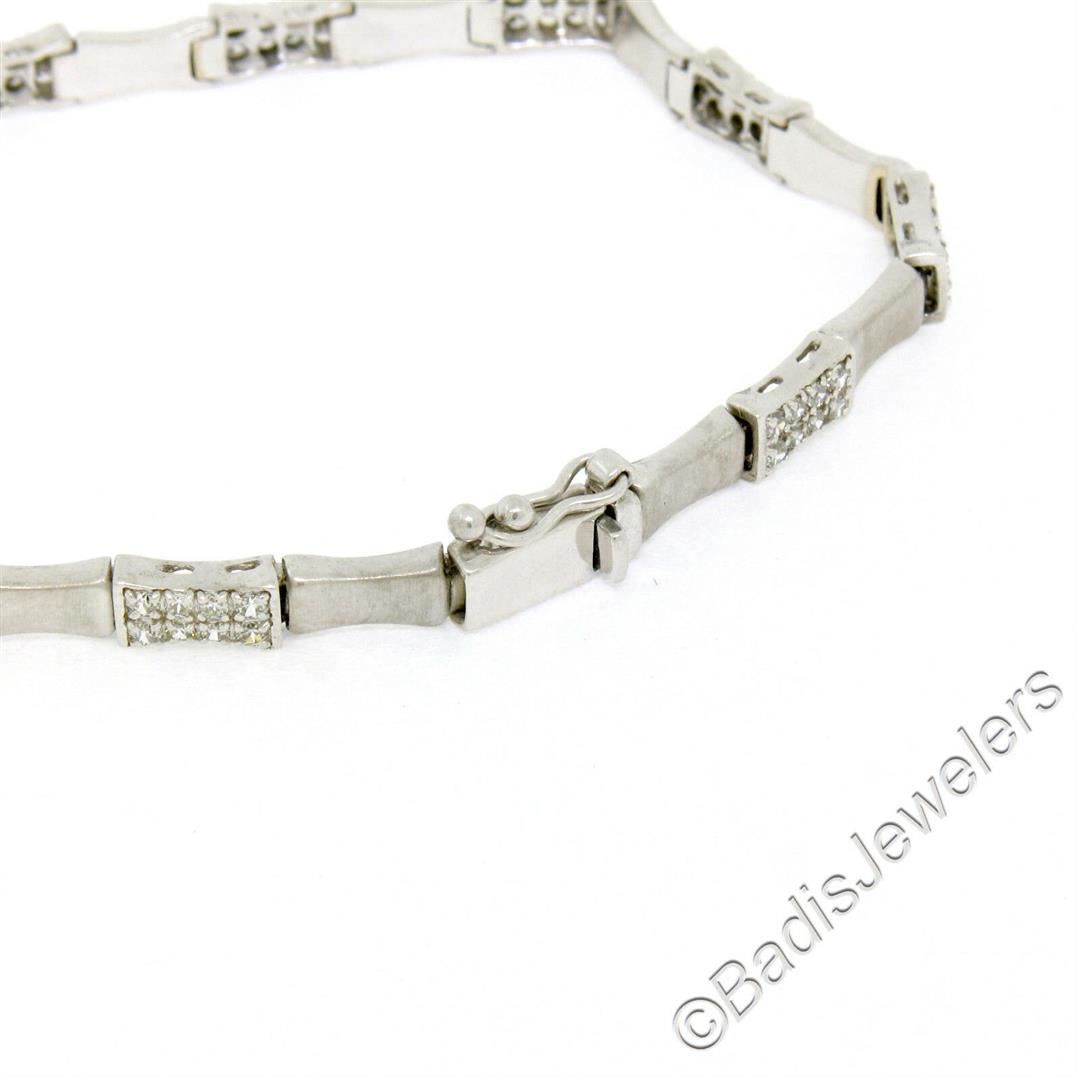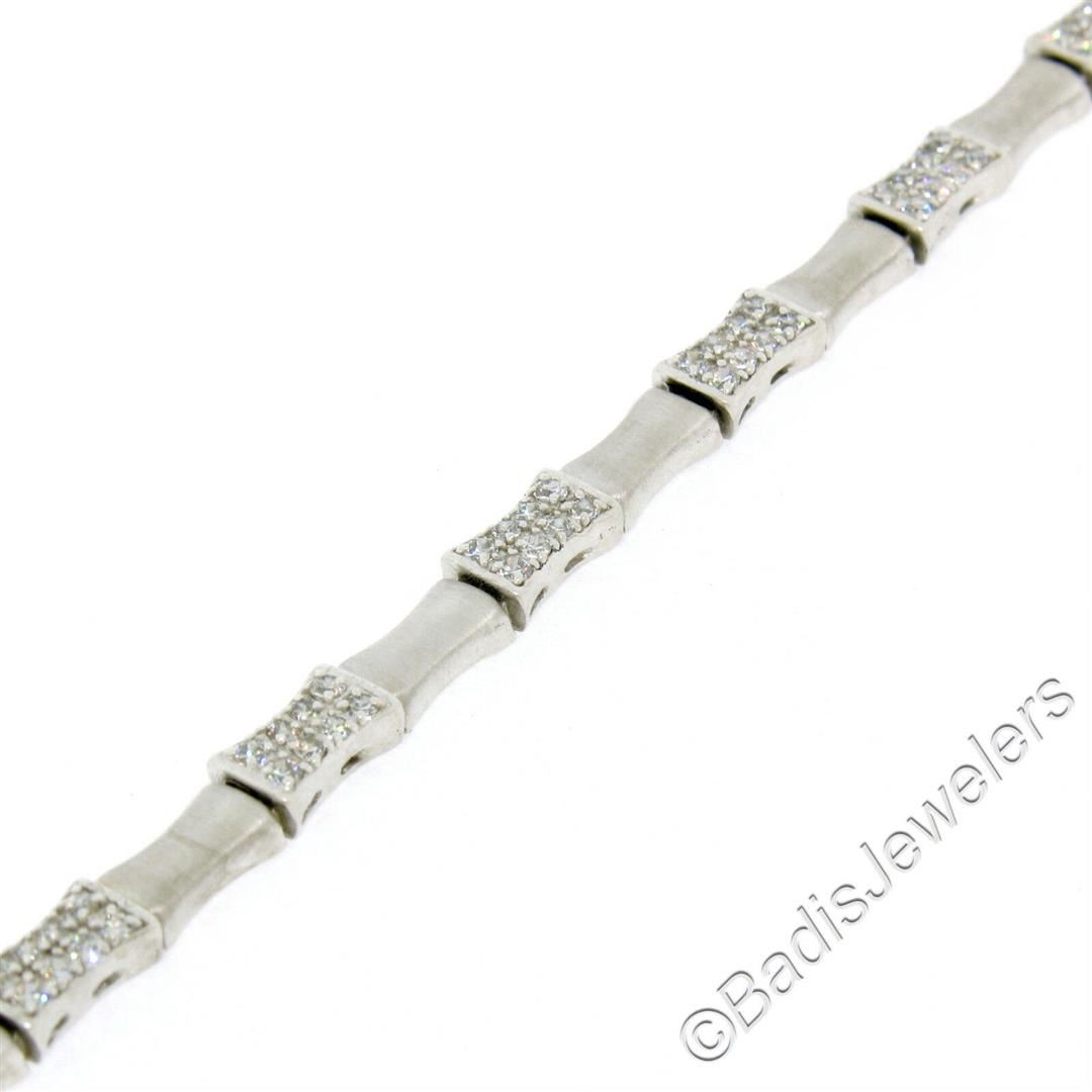 A like new 14kt white gold chain bracelet with 1.20ctw of round diamonds (F/G - VS1/VS2) set into stations which alternate with finely brushed concave links. It weighs a total of 10.71 grams, measures 5.0mm wide, and measures 7.5 inches long.