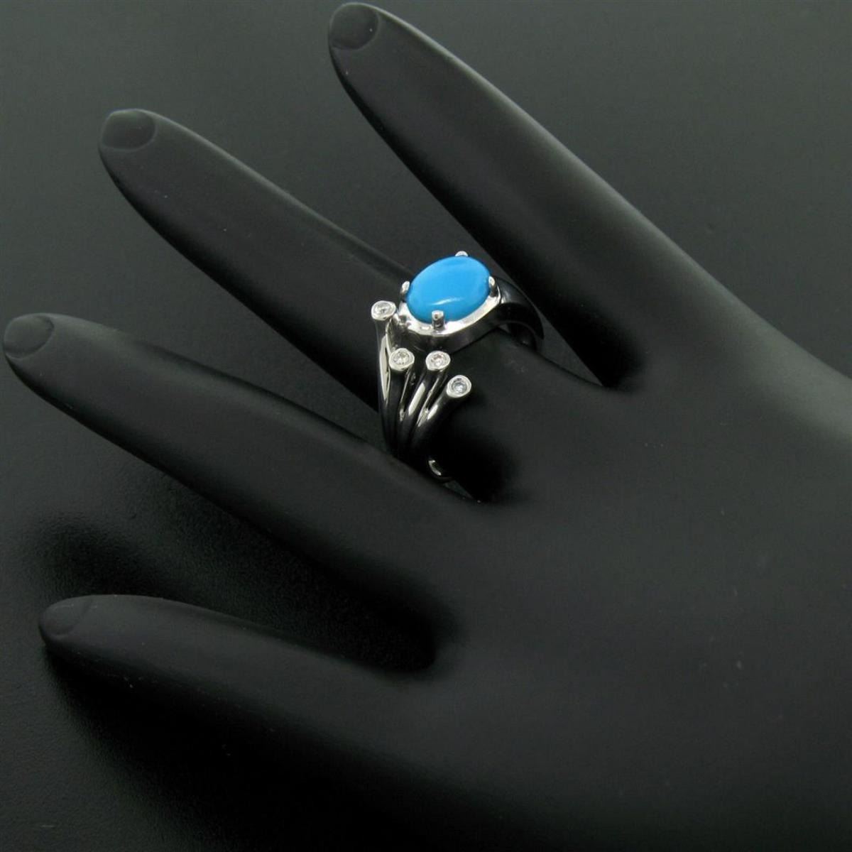 A 14kt white gold cocktail ring prong set with a 1.13ct oval cabochon turquoise accented by 4 round brilliant diamonds (G - VS2) totaling approximately 0.10 ctw. The ring is size 6.0, weighs a total of 5.68 grams, and measures 12.35mm wide.